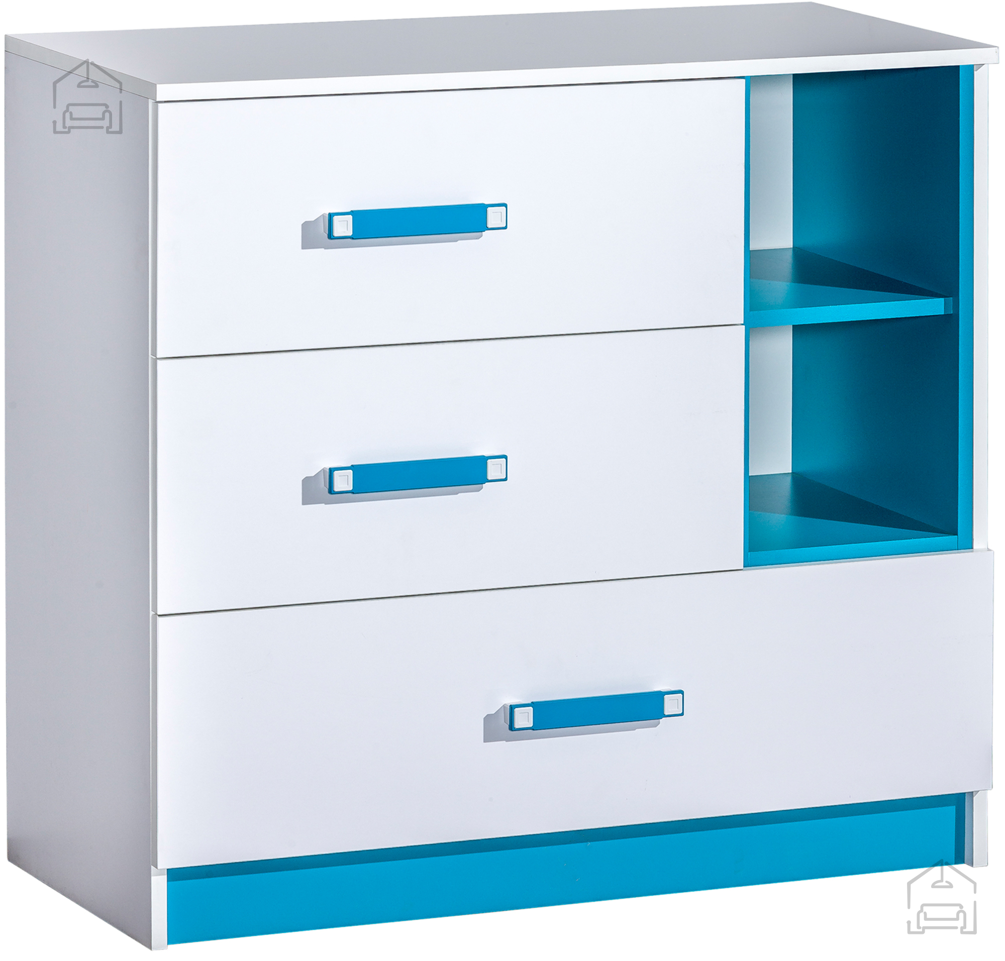 Die Kommode Trafiko 8 ist die ideale Wahl für alle, die Möbel mit einer gelungenen Verbindung von Funktionalität und ansprechendem Design suchen. Ihr schlichtes, modernes Erscheinungsbild lässt sich leicht mit unterschiedlichen Farben und Materialien kombinieren. Dank der hellen Töne und der türkisen Akzente passt sie hervorragend in Kinder‑ oder Jugendzimmer, aber auch in moderne Wohnräume, wo sie für einen frischen und zugleich aufgeräumten Eindruck sorgt. Die laminierte Oberfläche ist kratz‑ und feuchtigkeitsbeständig, sodass die Kommode lange ihren ursprünglichen Look behält.