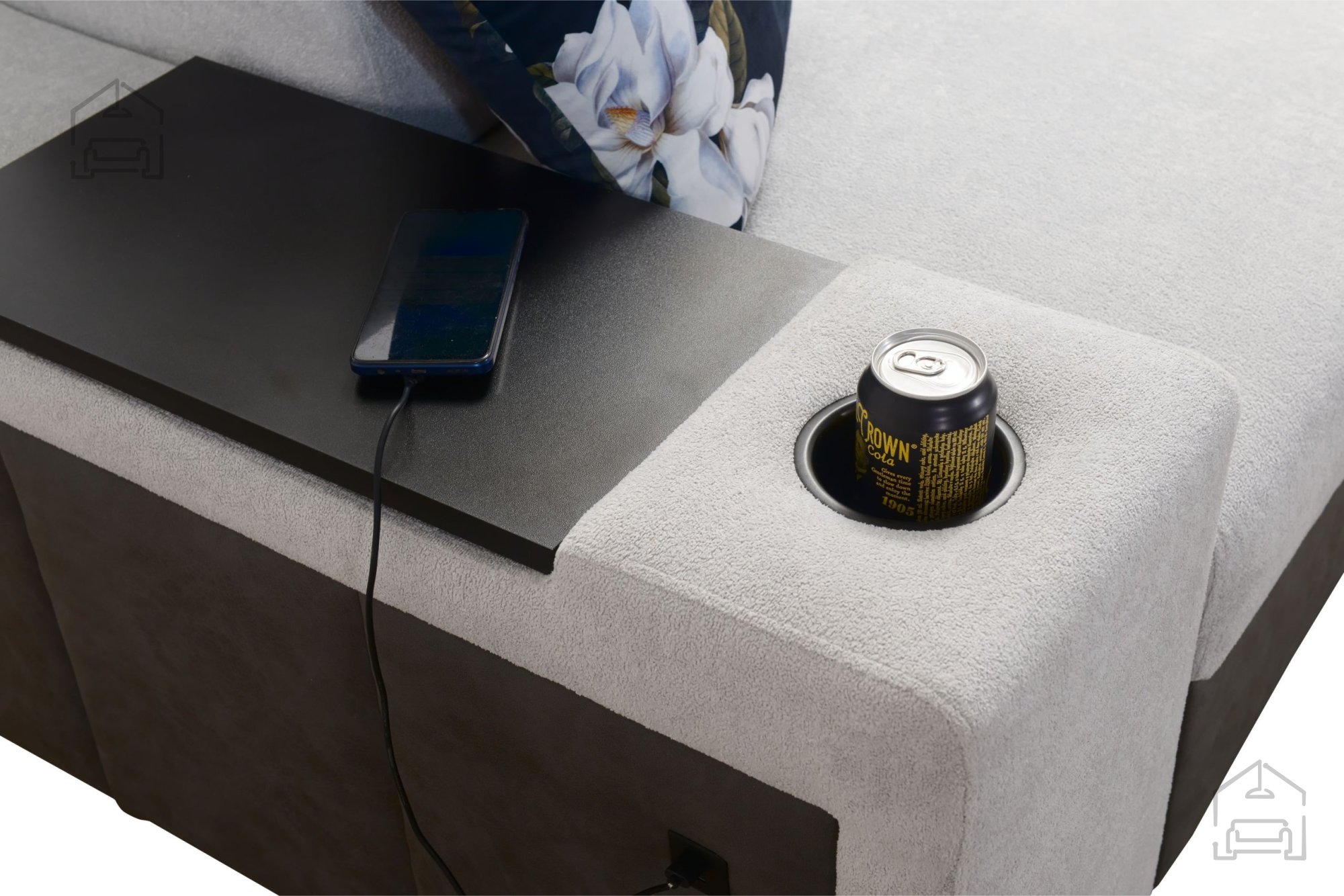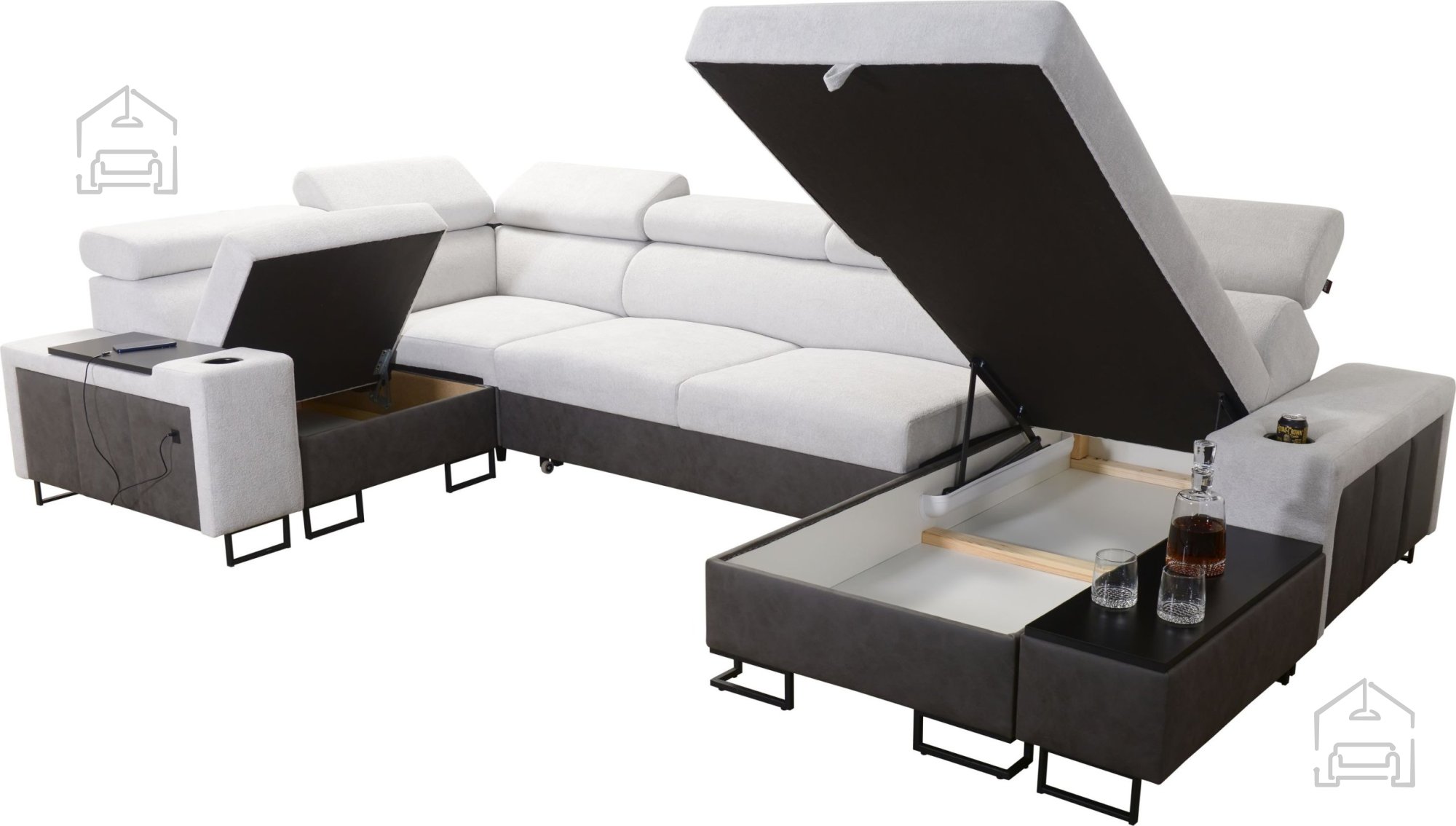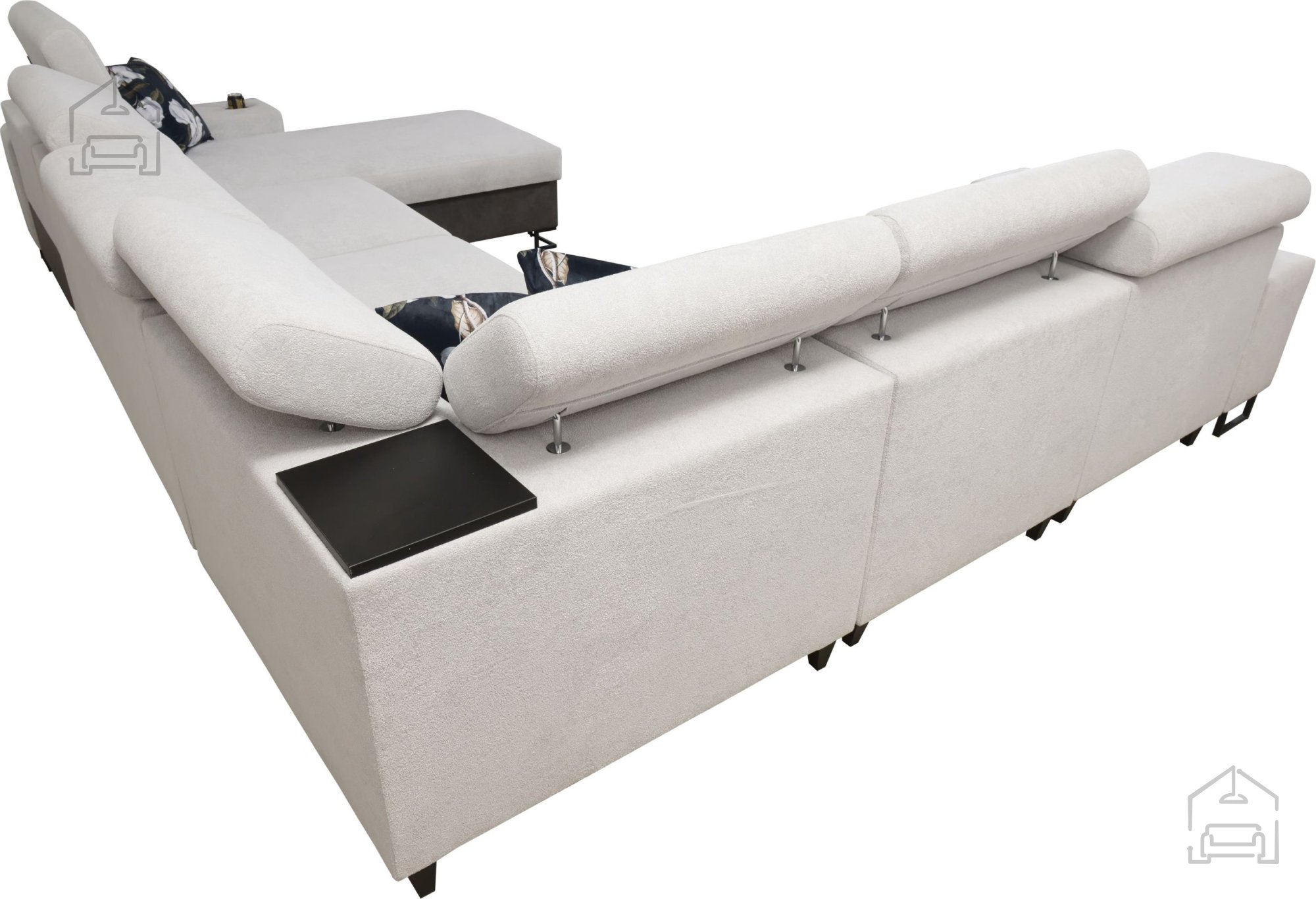 Die Wohnlandschaft ist mit einem Regal im Eckteil ausgestattet, das Design und Funktionalität ergänzt. Optional können Kissen mit Reißverschluss (gegen Aufpreis) bestellt werden, was Reinigung und Bezugstausch erleichtert. Die Liegefläche wird standardmäßig in einer kontrastierenden Farbkombination gefertigt, kann aber auf Wunsch – ebenfalls gegen Aufpreis – in der Stofffarbe der Garnitur bestellt werden. In der Standardausführung wählt der Hersteller den Farbton und die Struktur der Liegefläche zufällig aus, wodurch jedes Stück zu einem kleinen Unikat wird.