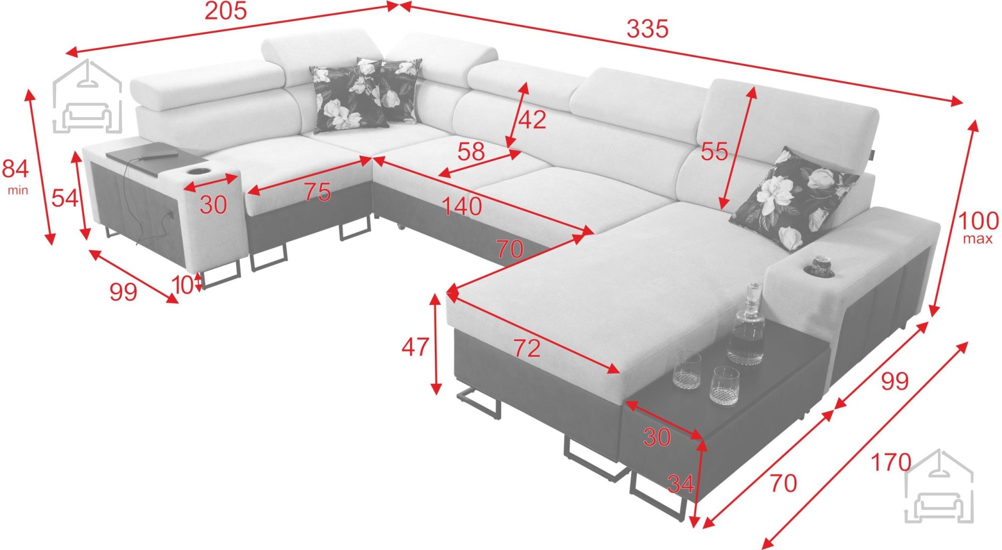 Die Garnitur verfügt über sechs verstellbare Kopfstützen, die sich individuell an Kopf- und Nackenposition anpassen lassen. Die Sitzhöhe von 47 cm sorgt für bequemes Sitzen, während die hochwertige Polsterung aus verstärktem T-30-Schaum und Wellenfedern optimalen Halt und Elastizität bietet. Auf Wunsch ist auch eine Variante mit HR-35-Schaum erhältlich, die eine höhere Dichte sowie eine ausgewogene Kombination aus Festigkeit und Flexibilität bietet.