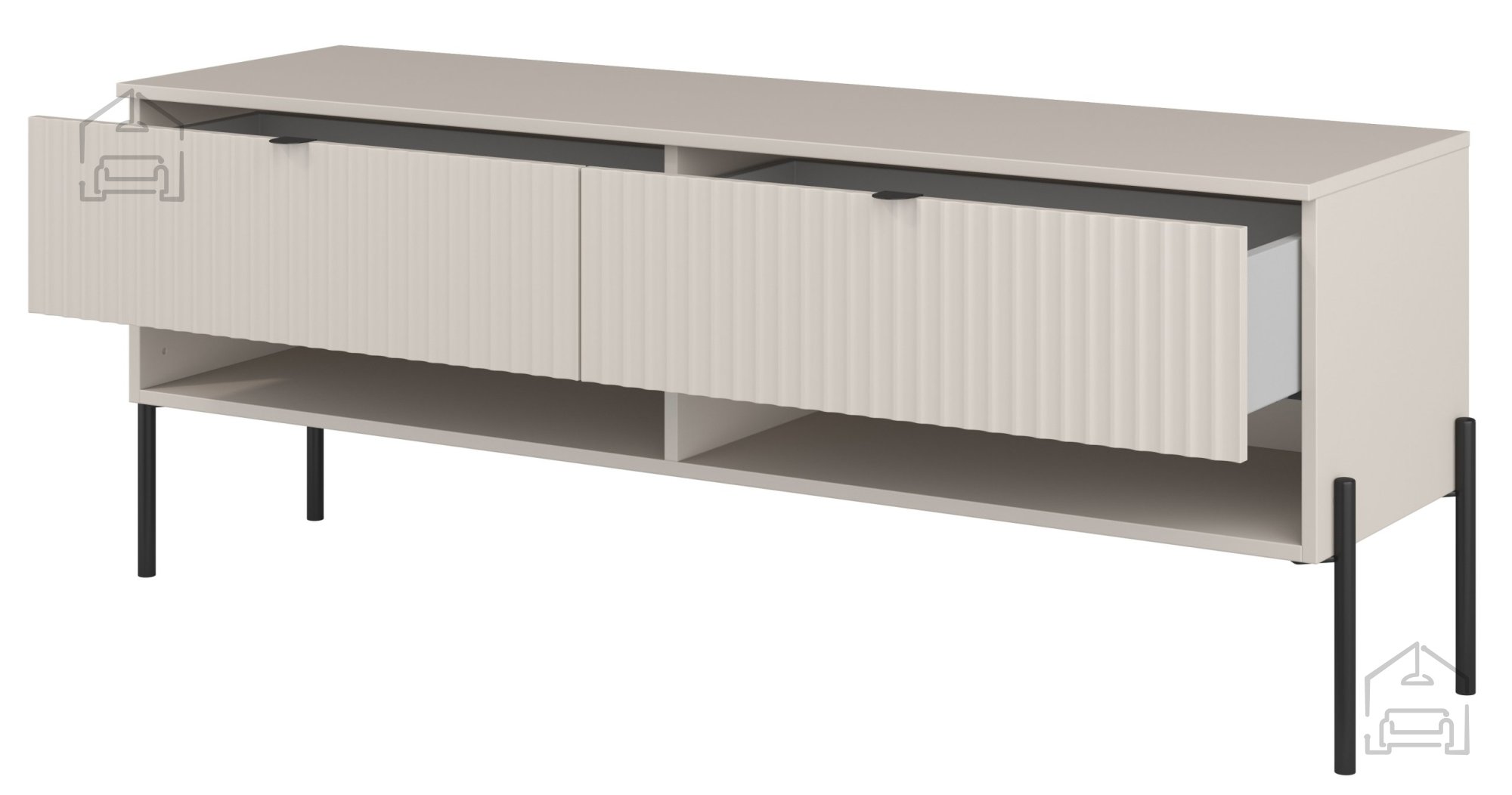 Die TV-Kommode Ore von Helvetia meble vereint moderne Schlichtheit mit funktionalem Design – ideal für alle, die im Wohnzimmer Wert auf ein harmonisches Zusammenspiel von Ästhetik und Alltagstauglichkeit legen. Die gerillte Oberfläche in Kaschmirfarbe verleiht Wärme und Eleganz, während die mattschwarzen Metallelemente einen dezenten industriellen Akzent setzen. Die Kommode ist so konstruiert, dass sie Ihrem Fernseher einen stabilen Platz bietet und zugleich praktischen Stauraum schafft.