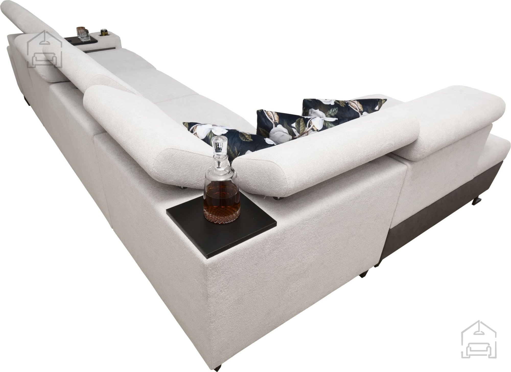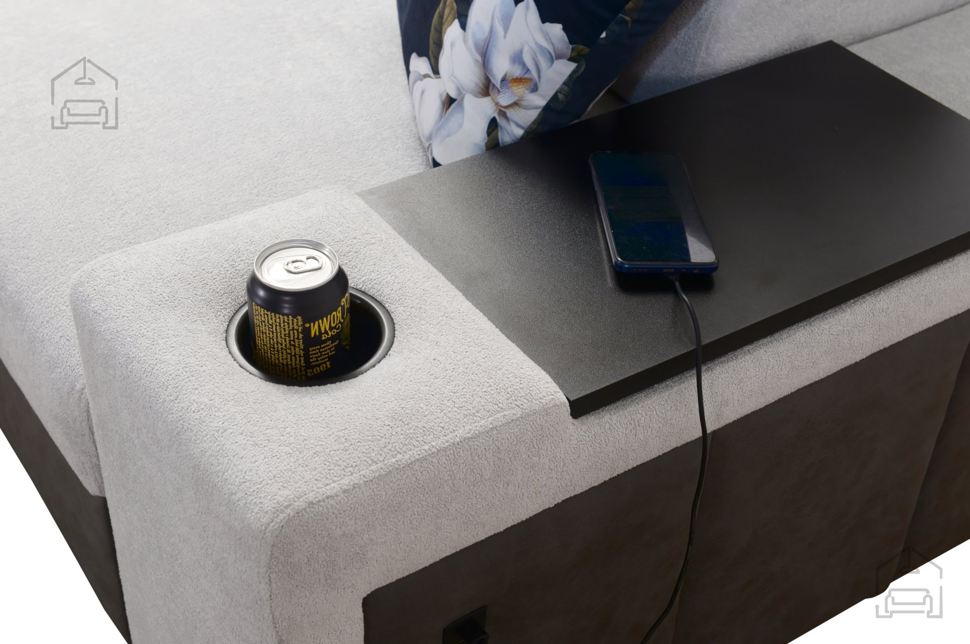 Die vorderen Füße sind wahlweise in verchromtem Metall oder schwarz matt lackiertem Metall erhältlich. Die hinteren Füße können aus Holz in den Farben Schwarz, Weiß, Olive, Wenge oder Buche gewählt werden. Gegen Aufpreis sind auch verchromte hintere Füße verfügbar, die einen modernen Akzent setzen. Zusätzlich können Sie praktische Getränkehalter (sogenannte „Cup Holder“) in Schwarz oder Silber auswählen – ideal beim Entspannen oder Fernsehen.
