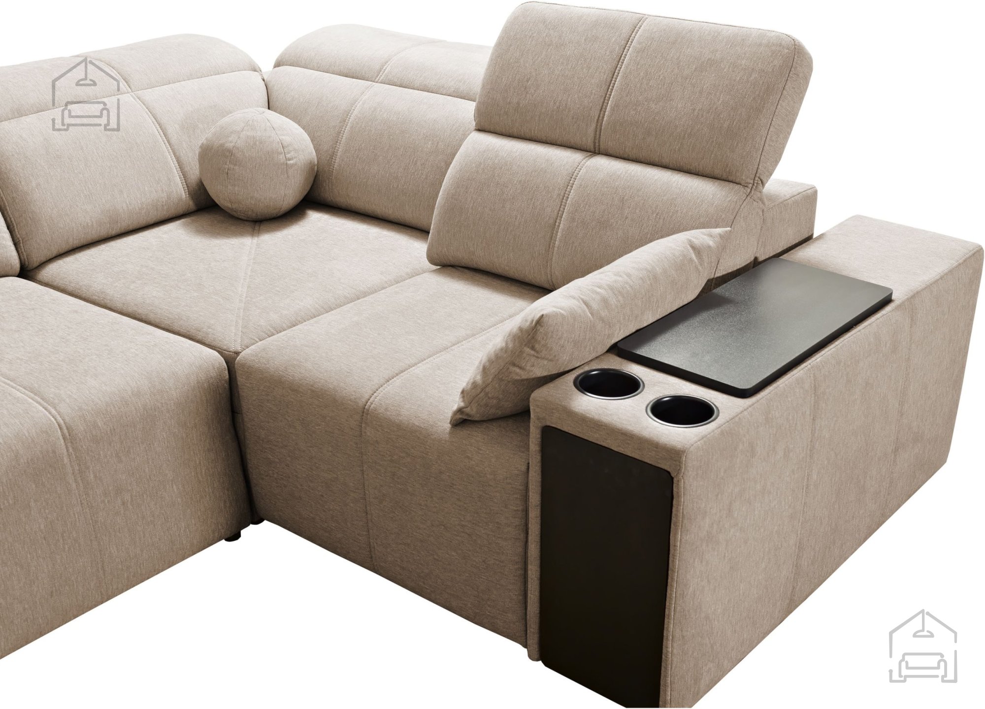 Mindy II überzeugt mit zahlreichen praktischen Details, die sie besonders alltagstauglich machen. Ein integrierter Bettkasten bietet Stauraum für Decken oder Pölster. Die fünf verstellbaren Kopfstützen lassen sich individuell in Höhe und Neigung anpassen – ideal für längeres Sitzen oder gemütliche Fernsehabende. Zusätzlich verfügt die Garnitur über zwei seitliche, aufklappbare Ablagen (Bars) für kleine Gegenstände, USB-Anschlüsse (A+C) zum Laden von Geräten sowie einen Getränkehalter (Cup Holder), der den Komfort im Alltag erhöht.