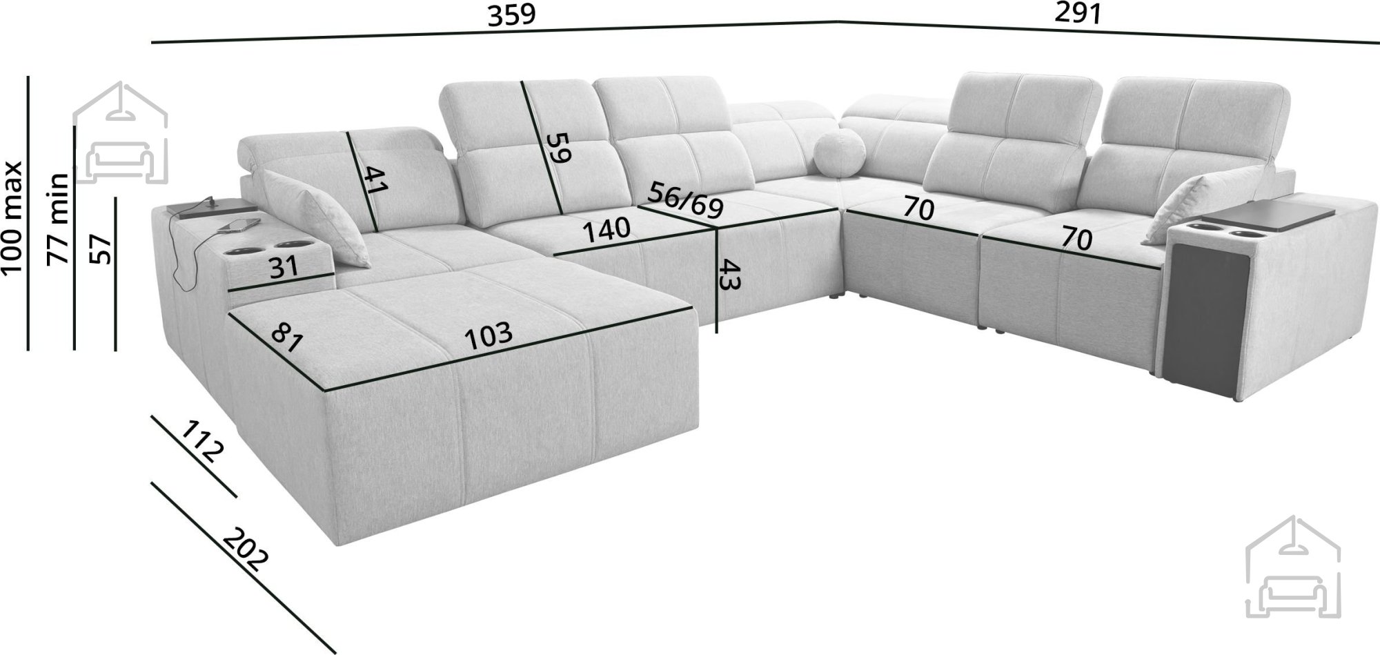 Mit seinen Abmessungen von 359x291x100 cm bietet Mindy VIII reichlich Platz für die ganze Familie. Die Sitzflächen basieren auf einem System aus Wellenfedern und einer 10 cm starken T-30-Schaumpolsterung, die eine optimale Körperunterstützung und dauerhafte Elastizität gewährleistet. Die Sitzhöhe beträgt 43 cm und sorgt so für eine bequeme, natürliche Sitzposition. Ein besonderes Highlight sind die verstellbaren Rückenlehnen, mit denen sich die Sitztiefe von 56 bis 69 cm individuell anpassen lässt. Das Hauptelement verfügt über eine durchgehende, verschiebbare Lehne, und auch der Liegeteilsitz bietet eine variable Rückenlehne.