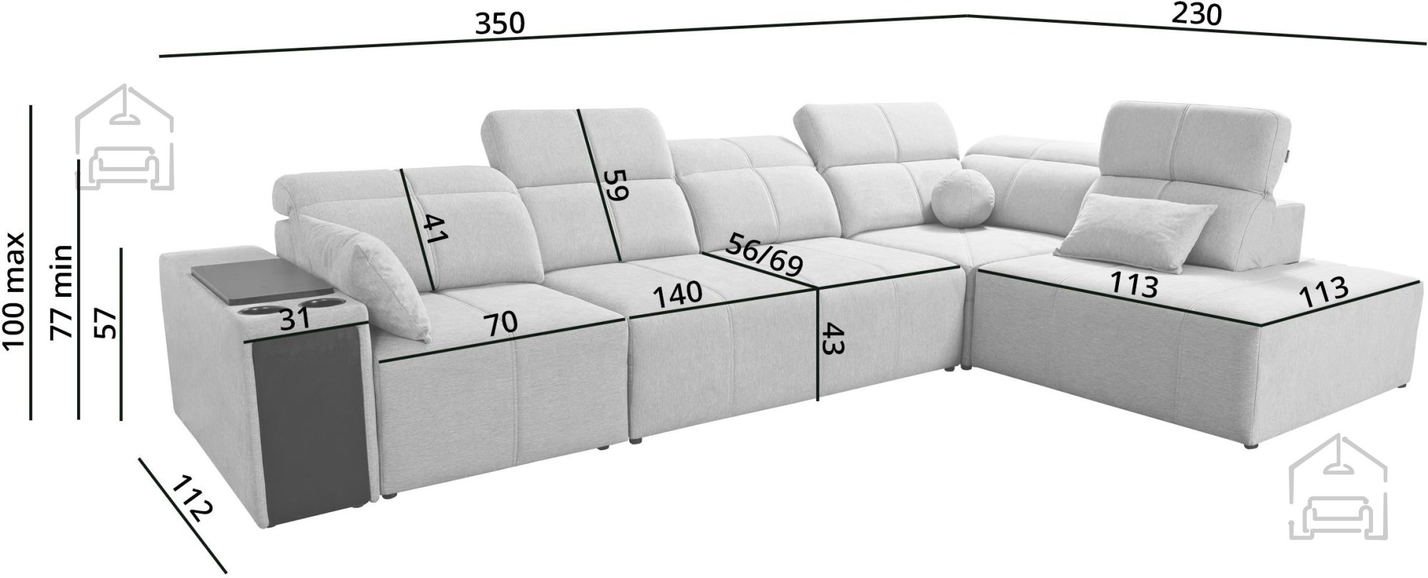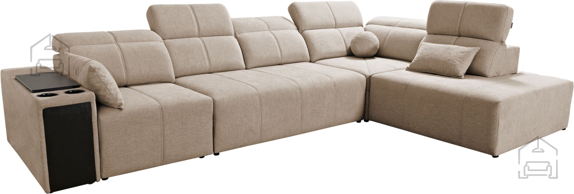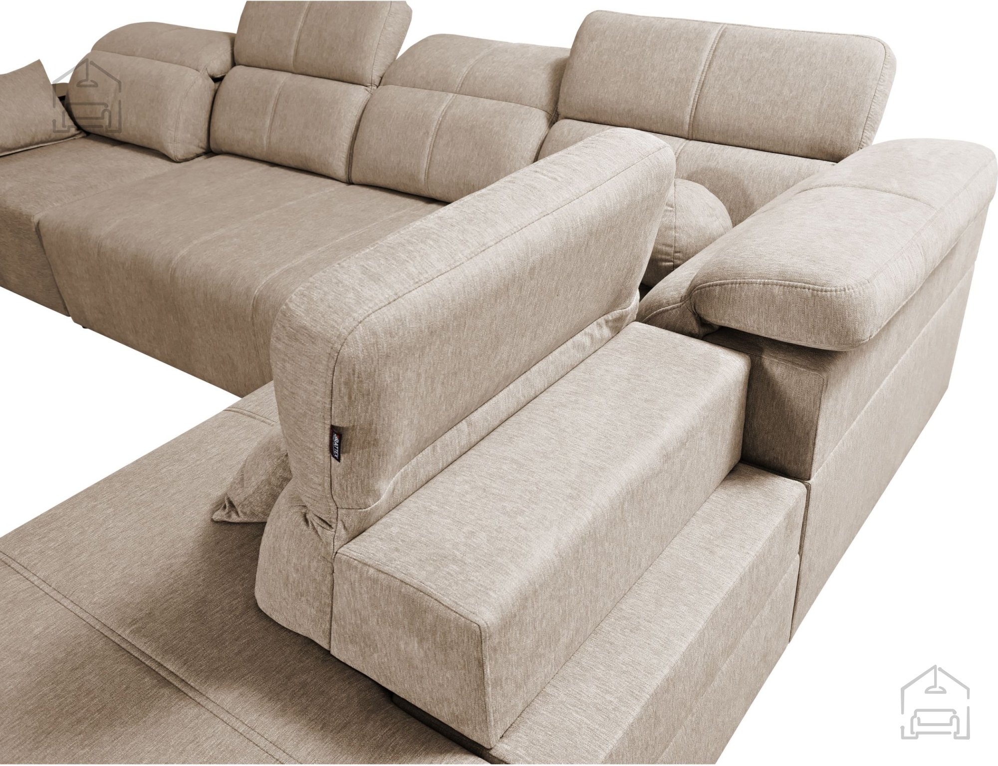 Die Eckgarnitur Mindy XI bietet zahlreiche praktische Aufbewahrungsmöglichkeiten. Es gibt zwei Bettkästen, in denen Decken, Kissen oder andere Textilien Platz finden. Zusätzlich ist das Modell mit zwei aufklappbaren Bars und einem Getränkehalter (Cup Holder) ausgestattet – ideal für den Alltag. Außerdem gehören fünf verstellbare Kopfstützen zur Ausstattung, die den Komfort und die Ergonomie zusätzlich erhöhen.