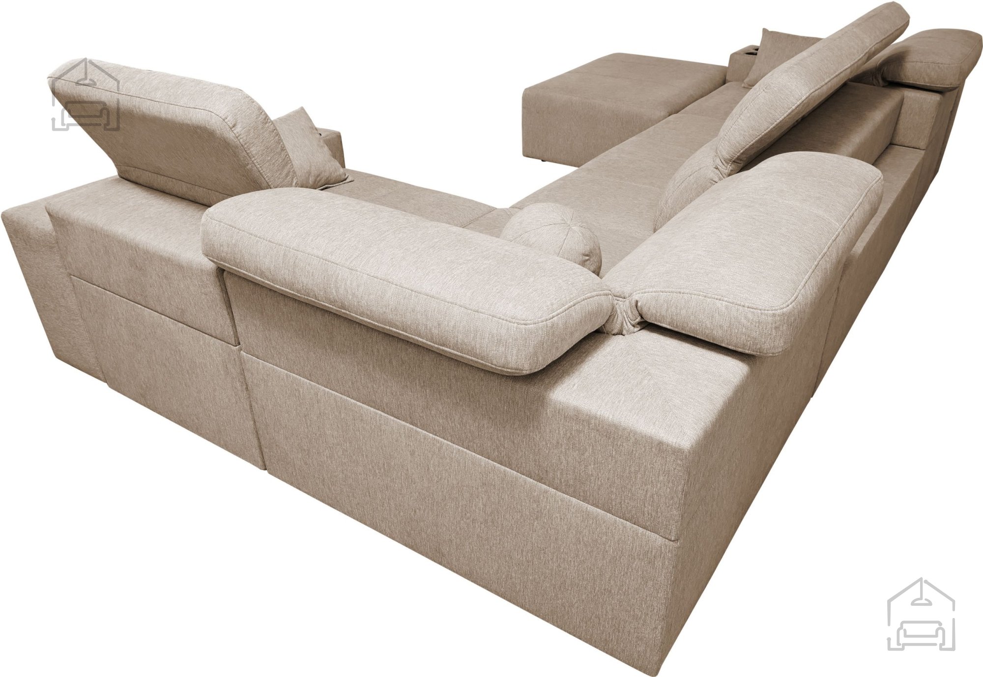 Die Garnitur ist mit sechs verstellbaren Kopfstützen und beweglichen Rückenlehnen ausgestattet, wodurch sich die Sitztiefe zwischen 56 und 69 cm variieren lässt. Der Hauptsitz („Doppelsegment“) besitzt eine durchgehende, verschiebbare Rückenlehne über die gesamte Breite, was den Komfort zusätzlich erhöht. Auch der Liegebereich verfügt über eine verstellbare Rückenlehne, sodass sich das Sofa perfekt an individuelle Bedürfnisse anpassen lässt.