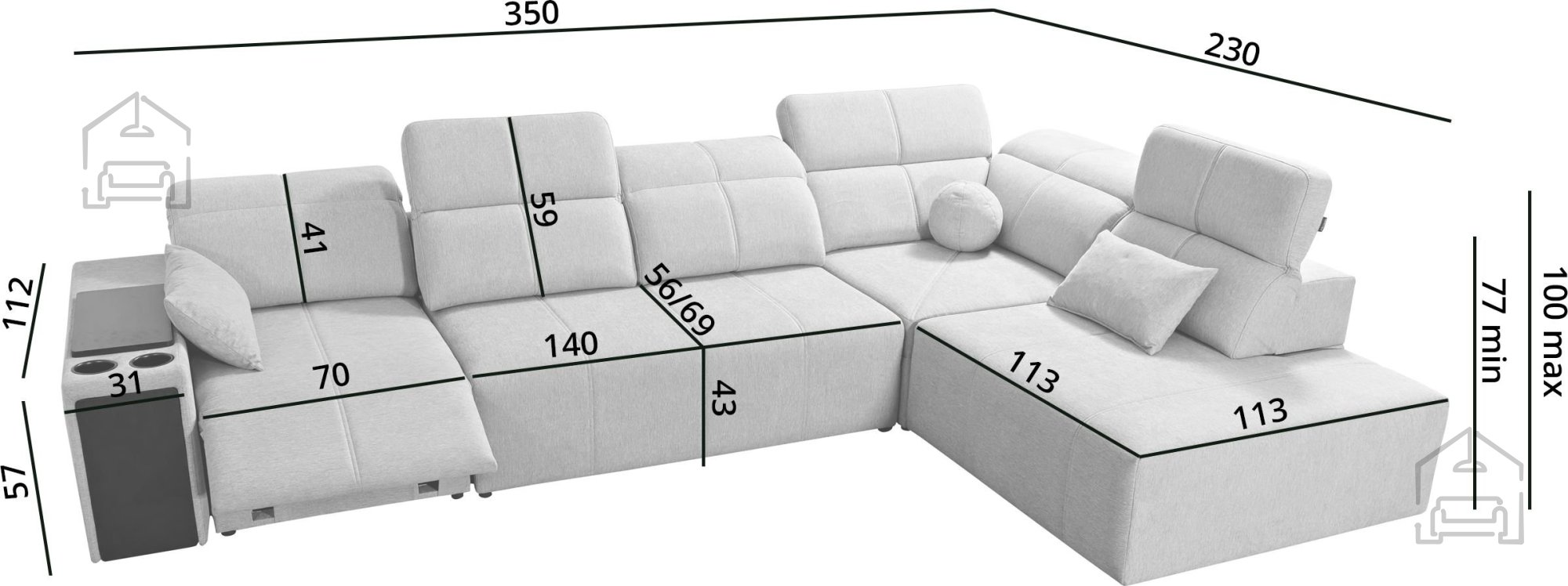 Das Sofa ist mit verstellbaren Rückenlehnen ausgestattet, mit denen sich die Sitztiefe einfach zwischen 56 und 69 cm anpassen lässt. So findet jedes Familienmitglied seine ideale Position – unabhängig von Körpergröße oder gewünschter Rückenstütze. Die Kopfstützen sind individuell verstellbar – insgesamt sechs Stück – und bieten optimalen Halt für Nacken und Kopf beim Lesen, Fernsehen oder Entspannen.