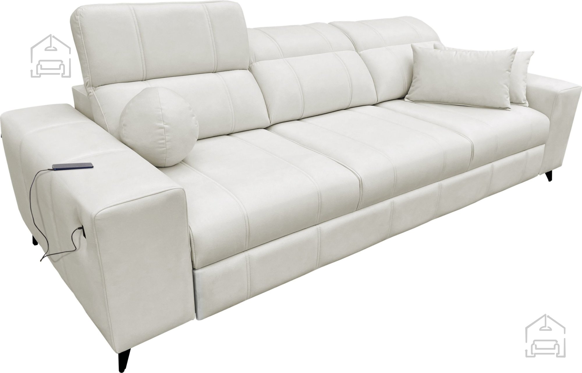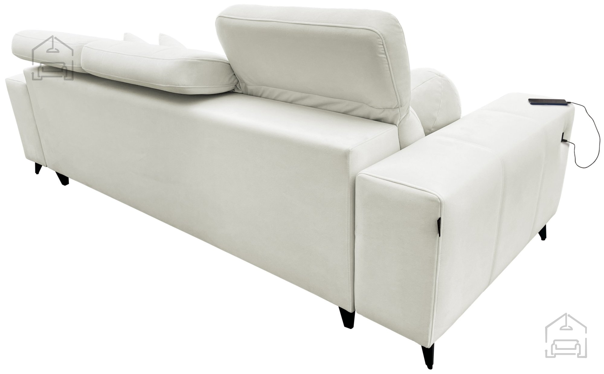 Das Sofa Dafne ist mit drei verstellbaren Kopfstützen ausgestattet, die individuell angepasst werden können und so für noch mehr Komfort sorgen. Außerdem verfügt es über USB-Anschlüsse vom Typ A und C, mit denen sich Smartphones oder andere Geräte bequem während des Relaxens aufladen lassen. Das Sofa ist freistehend, das heißt, auch die Rückseite ist ansprechend verarbeitet und eignet sich somit ideal für die Platzierung mitten im Raum.