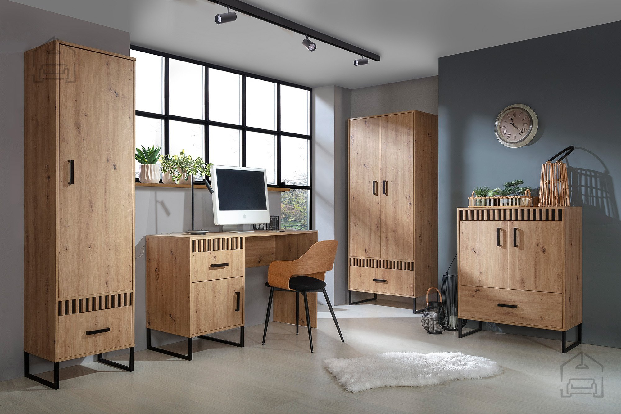 Gefertigt wird das Regal in der Domel-Fabrik in Polen, wo höchste Qualitäts- und Präzisionsstandards gelten. Die Materialien werden sorgfältig ausgewählt, und die Produktionsprozesse sind auf Stabilität und Nachhaltigkeit ausgelegt. Besonderes Augenmerk gilt den Details – alle Verbindungen sind fest, die Oberflächen gleichmäßig bearbeitet. Jedes Stück aus der Domel-Produktion vereint moderne Technologie mit traditionellem Know-how und steht für ein langlebiges, verlässliches Produkt.