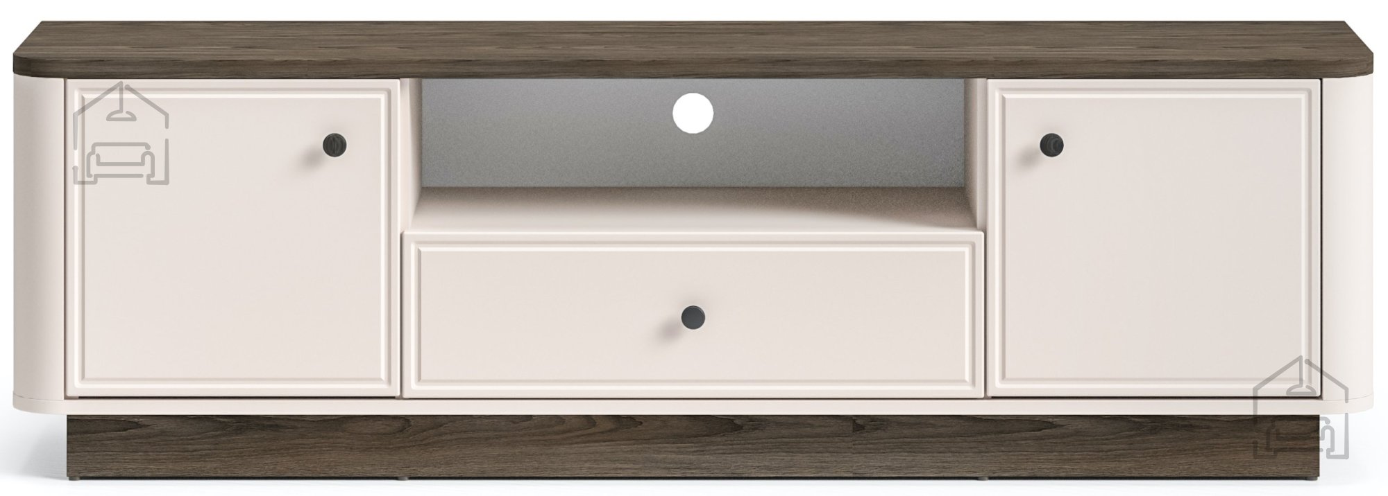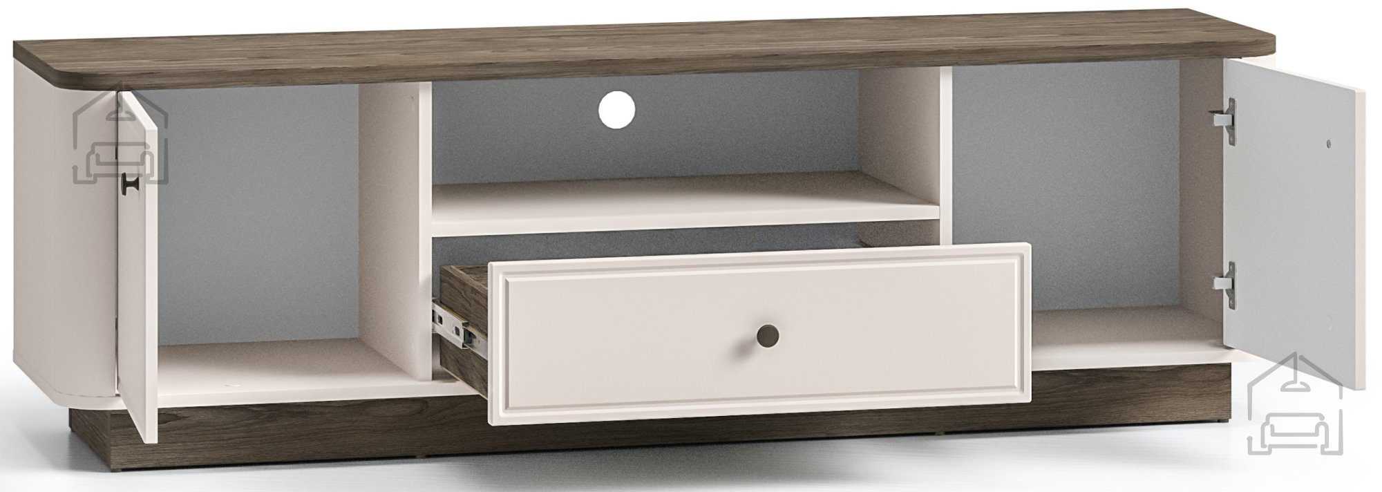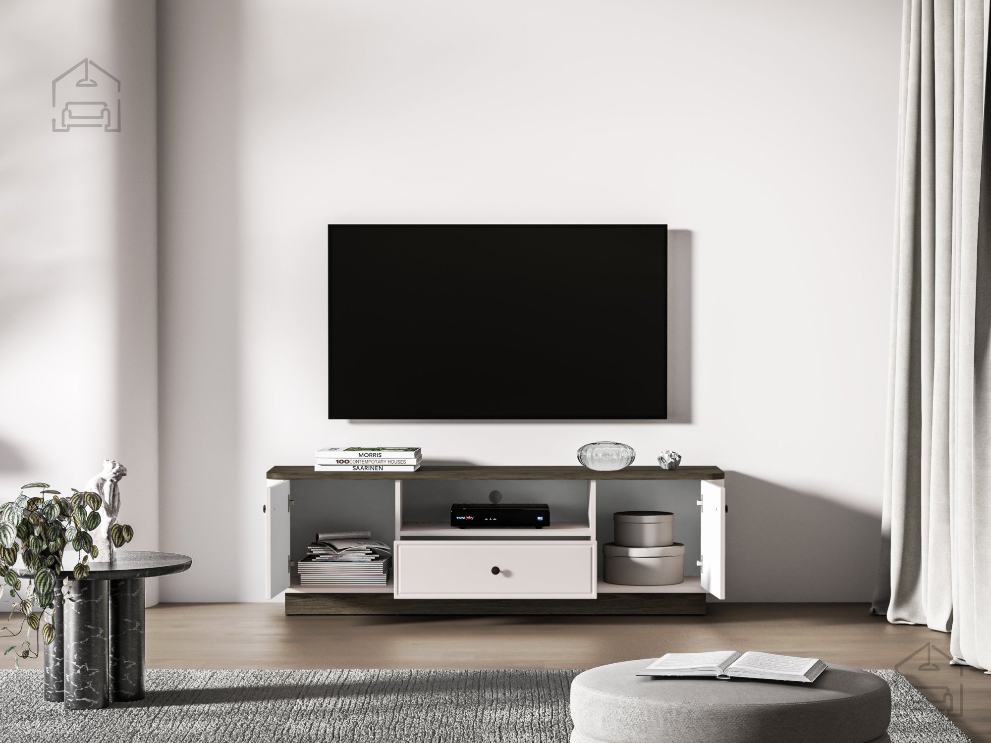 Obwohl sie als TV-Kommode konzipiert ist, eignet sich die Vilavio 05 ebenso für Schlaf- oder Vorzimmer. Im Schlafzimmer kann sie als niedrige Ablagefläche oder als stilvolles Element unter einem Spiegel dienen, im Eingangsbereich bietet sie Platz für Accessoires und Dekorationen. Durch die neutrale Farbkombination lässt sie sich mühelos mit verschiedensten Einrichtungsstilen kombinieren – von klassisch bis modern.