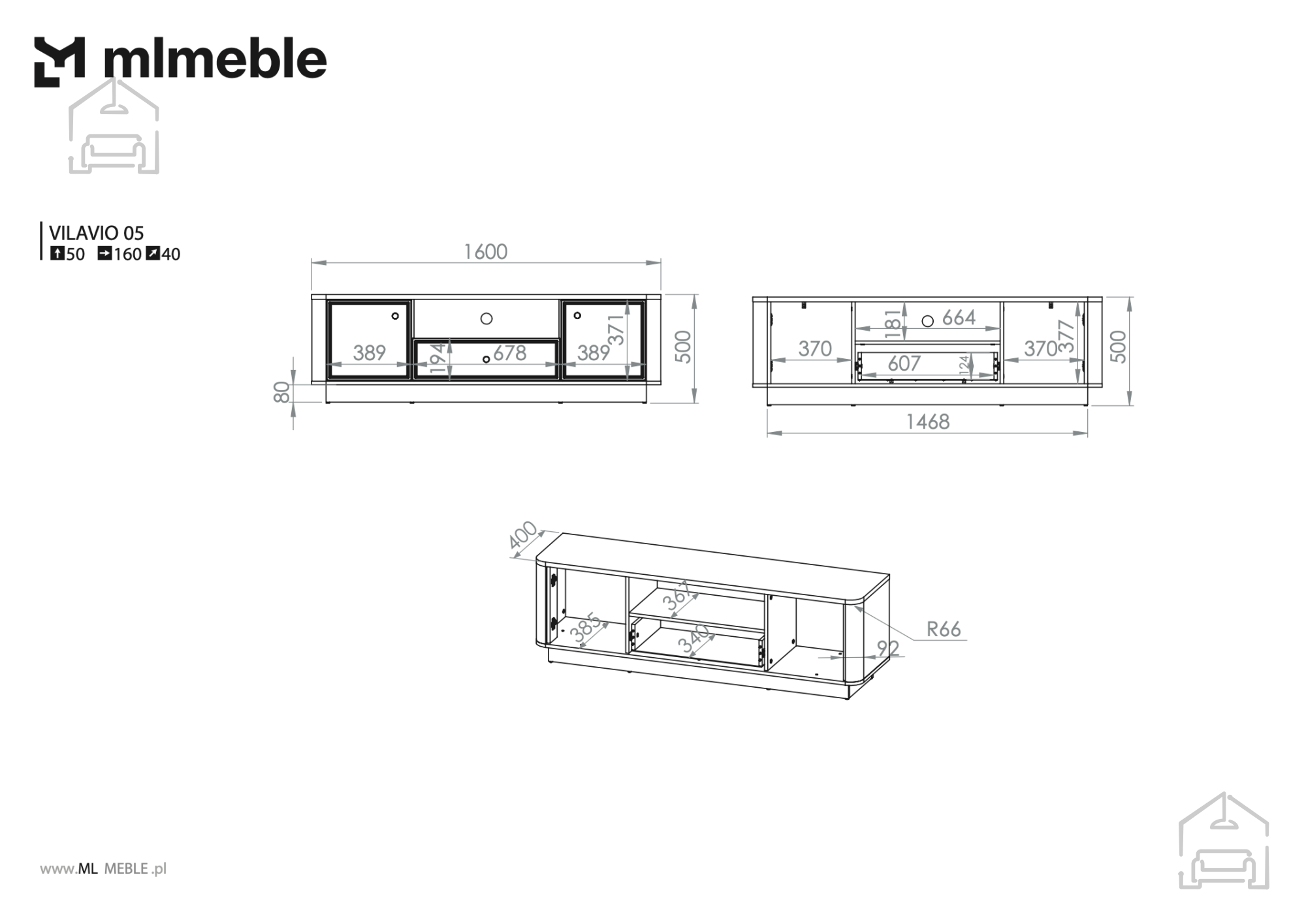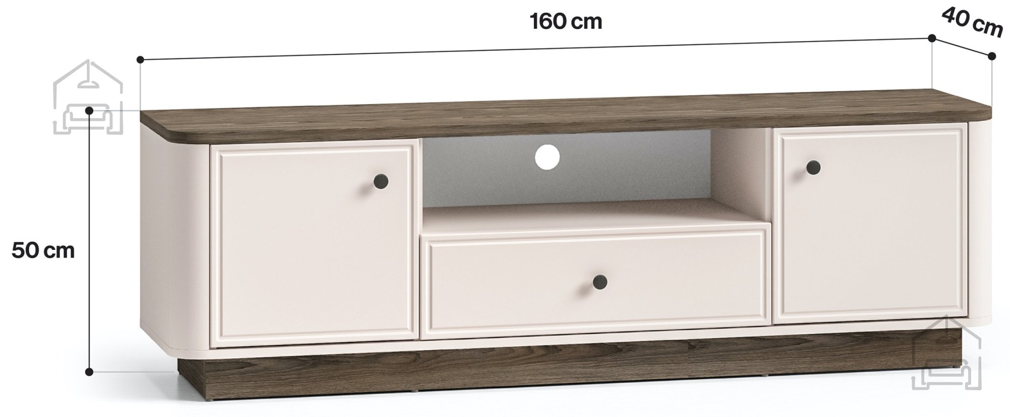 Die Kommode Vilavio 05 ist so gestaltet, dass sie den vielfältigen Anforderungen eines modernen Zuhauses gerecht wird. Auf der oberen Fläche findet der Fernseher Platz, während der Innenraum Stauraum für Multimedia-Geräte, Bücher oder Accessoires bietet. Die Kombination aus geschlossenen Fächern und offenen Ablagen ermöglicht eine aufgeräumte Ordnung und bewahrt dennoch eine leichte, offene Optik. Dank der durchdachten Maße von 160 × 40 × 50 cm passt die Kommode auch gut in kleinere Räume, ohne an Funktionalität einzubüßen.