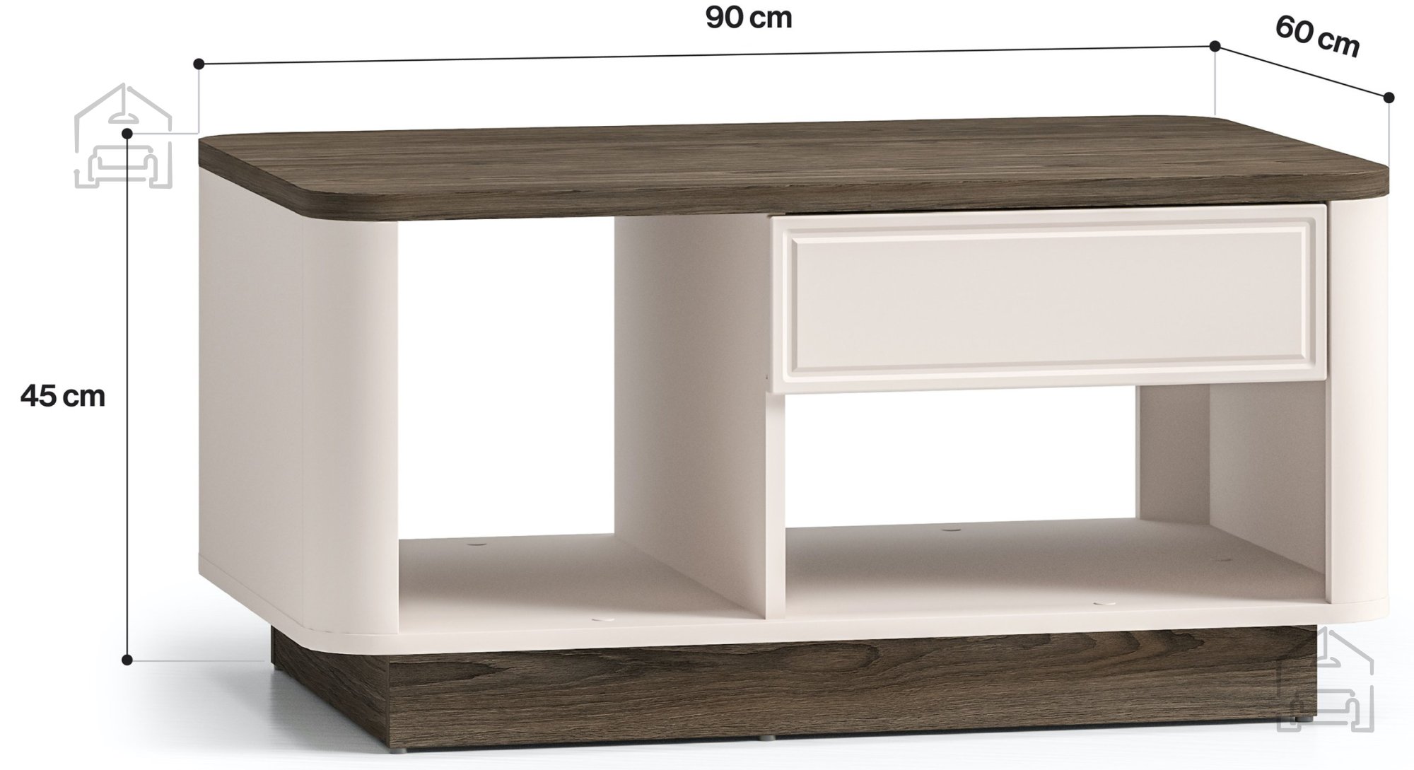 Der Couchtisch Vilavio 05 der Marke ML Meble vereint modernes Design, hochwertige Materialien und durchdachte Funktionalität. Die harmonische Farbkombination aus dunkler Eiche Windmill, Kaschmir und Weiß schafft einen angenehmen visuellen Kontrast, der sich elegant an verschiedene Einrichtungsstile anpasst. Mit seinen kompakten Maßen von 90 × 60 × 45 cm ist der Tisch die ideale Wahl für das Wohn- oder Schlafzimmer, wo er den Raum mit seiner dezenten Präsenz und praktischen Nutzbarkeit bereichert.