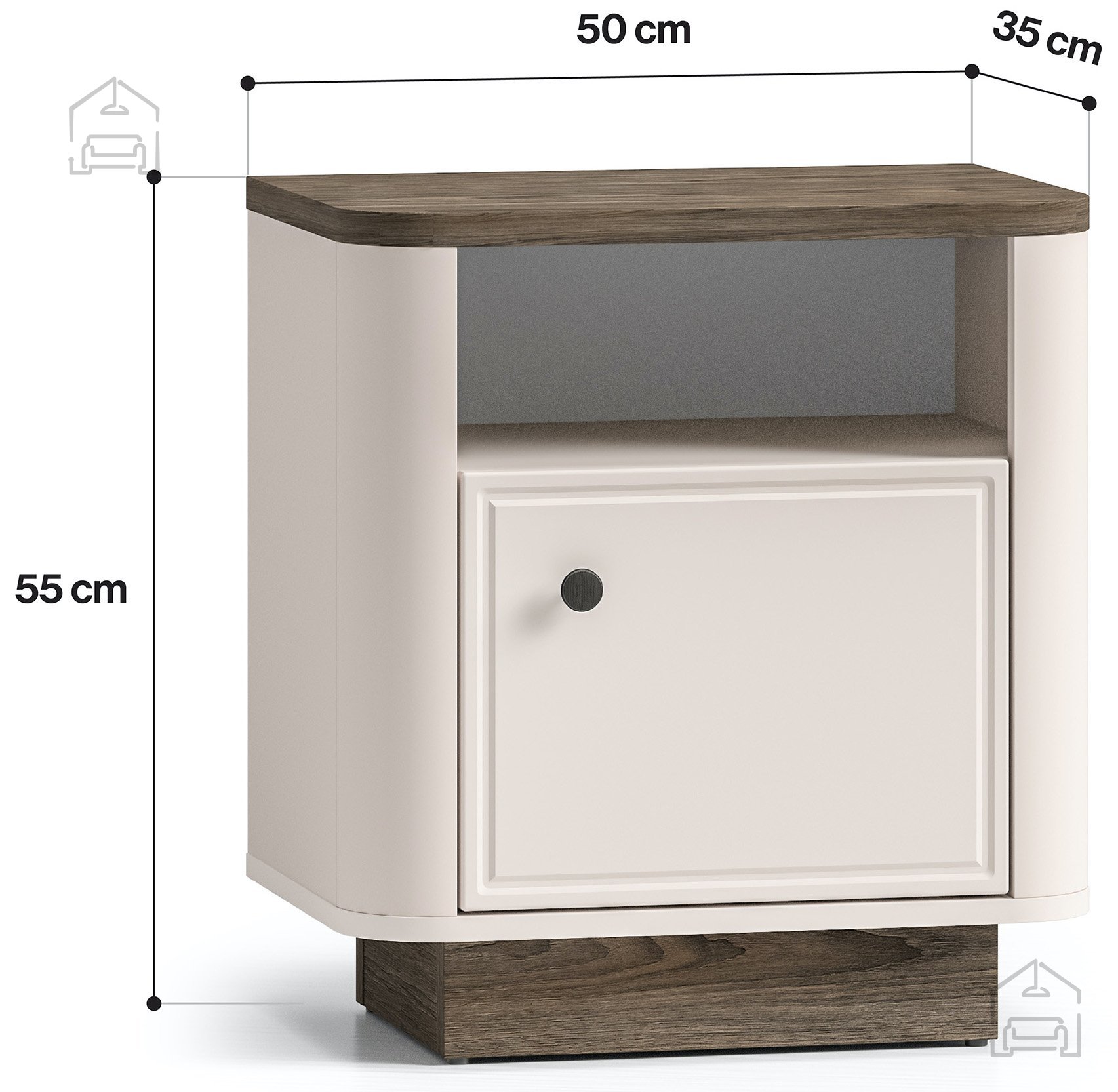 Mit den Abmessungen von 50 × 35 × 55 cm bietet der Nachttisch ein ideales Verhältnis von Stauraum und kompakter Größe. Der Vilavio 07 ist groß genug, um Lampe, Buch oder persönliche Gegenstände griffbereit zu halten, nimmt aber trotzdem nicht zu viel Platz neben dem Bett ein. Dank seiner durchdachten Höhe passt er sowohl zu klassischen als auch zu modernen Bettgestellen.