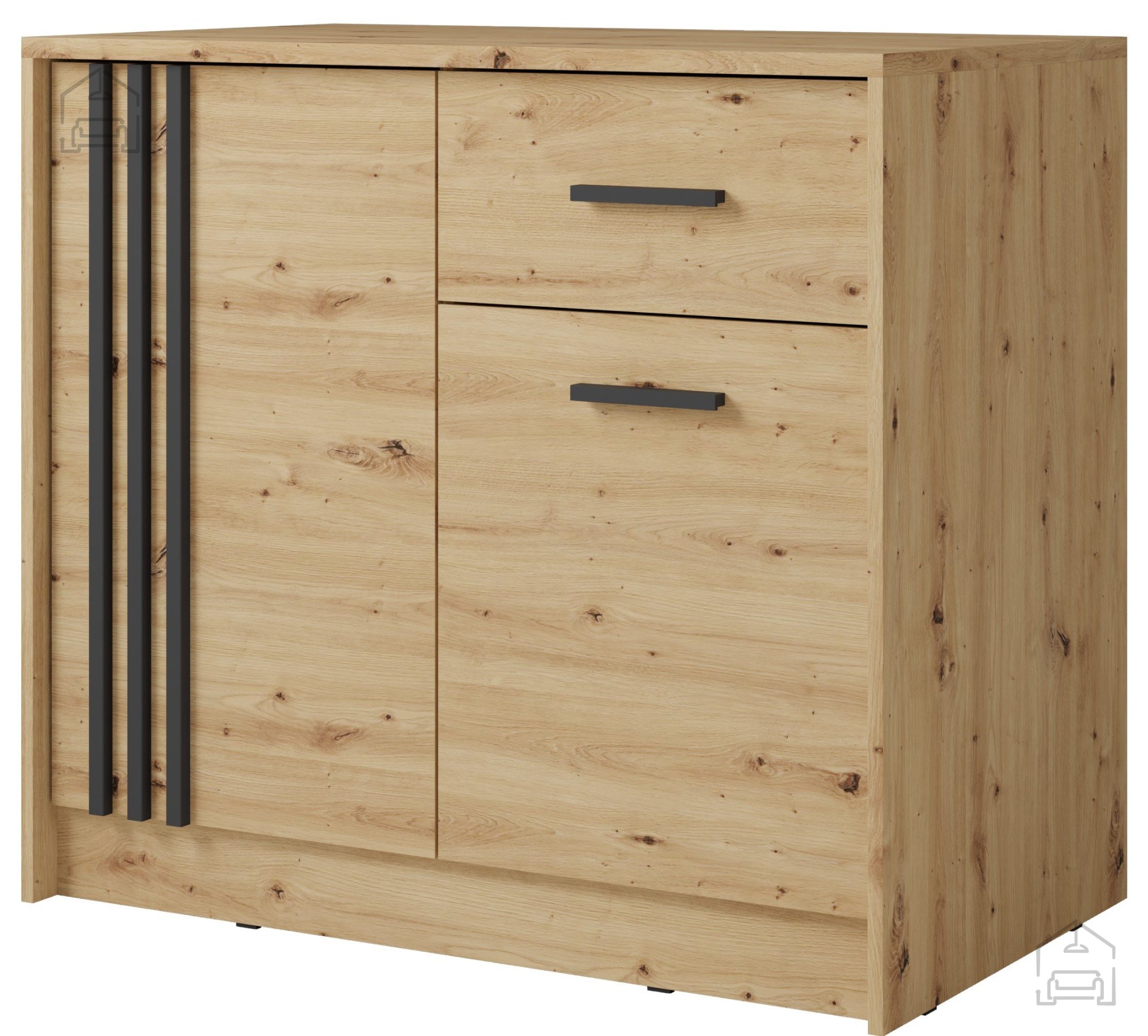 Das Modell ist in der Farbe Artisan-Eiche gestaltet, die eine natürliche Wärme und Behaglichkeit ausstrahlt. Dieser Ton harmoniert wunderbar mit den schwarzen Details und verleiht der Kommode den Charakter moderner Möbel mit einem dezenten industriellen Touch. Die Farbgebung lässt sich mühelos mit anderen Einrichtungselementen kombinieren – egal ob aus Holz oder Metall.
