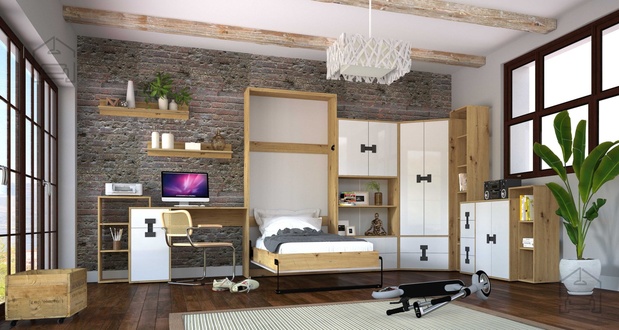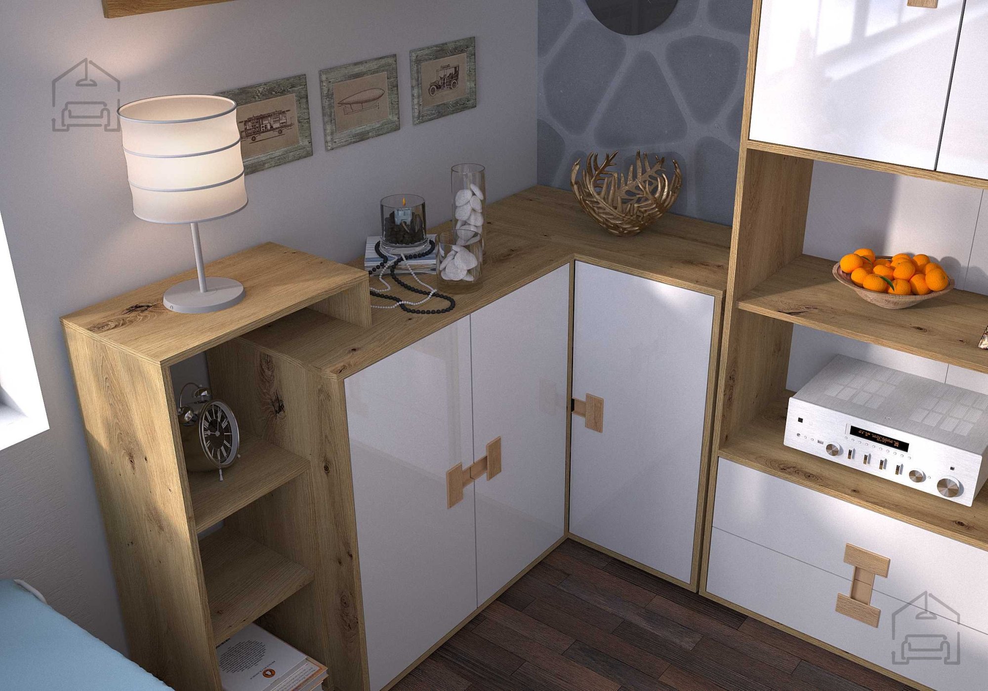 Die gesamte Kollektion besteht aus 16 mm starken, laminierten Spanplatten, die Stabilität, Langlebigkeit und einfache Pflege gewährleisten. Die Oberflächen sind widerstandsfähig gegen tägliche Beanspruchung und zugleich glatt und angenehm im Griff. Die Farbkombination aus Hochglanzweiß und Artisan-Eiche verleiht dem Raum ein Gefühl von Reinheit und Wärme – besonders wichtig in Kinder- und Jugendzimmern. Gefertigt wird die Kollektion in der Domel-Fabrik in Polen, wo präzise Verarbeitung und moderne Produktionstechnologie Hand in Hand gehen.