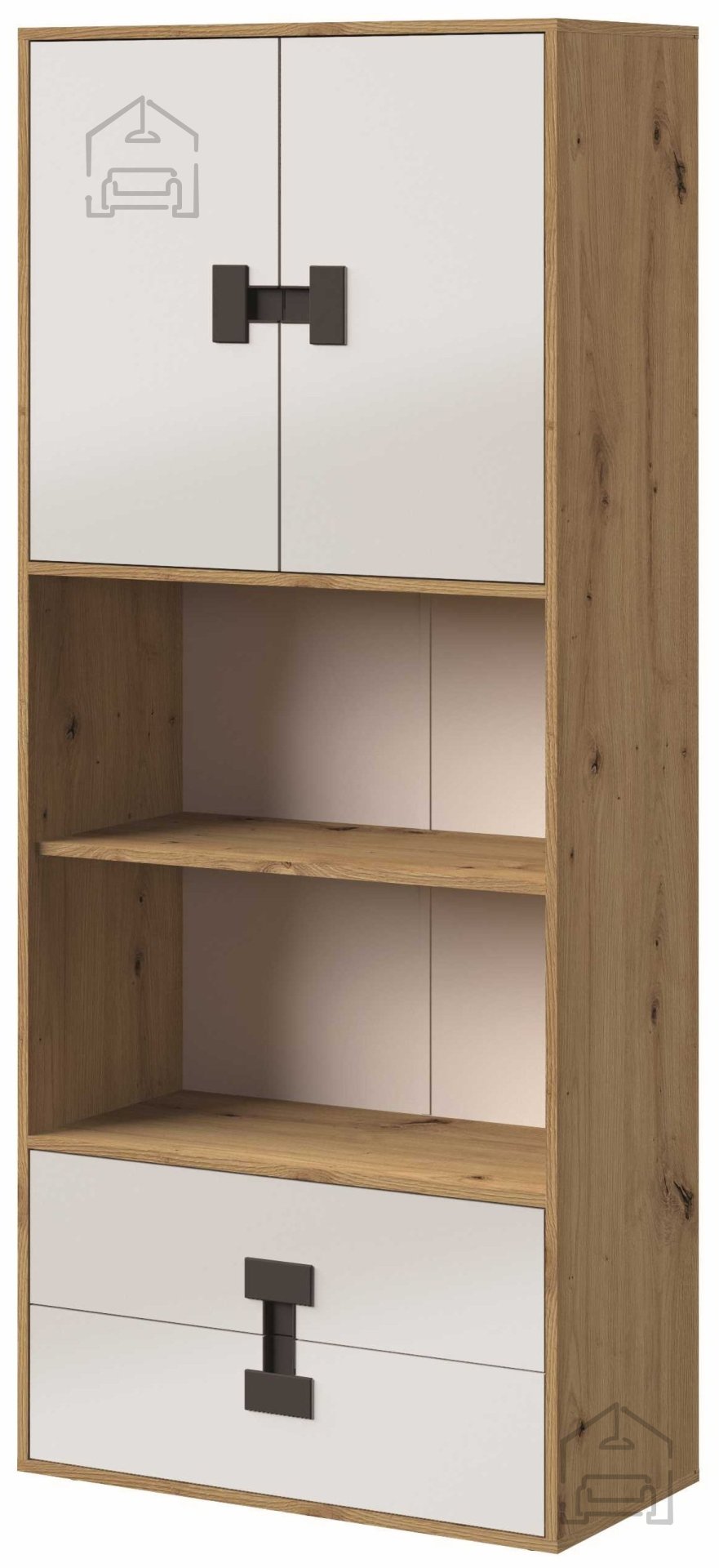 Ein besonderes Augenmerk gilt den Griffen, die in mehreren Farben erhältlich sind – weiß, schwarz, eiche und grau. So lässt sich das Regal individuell an persönliche Vorlieben und die Farbgestaltung des Raumes anpassen. Die ergonomisch geformten Griffe erleichtern das Öffnen von Türen und Laden und tragen zum stimmigen Gesamtbild bei. Die Hochglanzoberfläche in Weiß reflektiert das Licht und lässt den Raum größer wirken, während die Elemente in Artisan-Eiche eine natürliche Note hinzufügen.