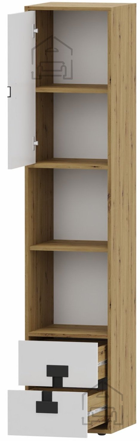 Das Regal Index 06 – Domel ist ideal für alle, die ein klares, modernes Design schätzen, dabei aber nicht auf die warme Ausstrahlung von Holz verzichten möchten. Die Oberfläche in Weiß Hochglanz reflektiert das Licht und sorgt für ein luftiges Raumgefühl, während die Dekorfarbe Artisan Eiche eine natürliche Struktur und harmonische Balance schafft. Diese Kombination macht das Regal zu einem vielseitigen Begleiter – ob in minimalistischen, klassischen oder gemütlichen Wohnräumen, Büros oder Vorzimmern.