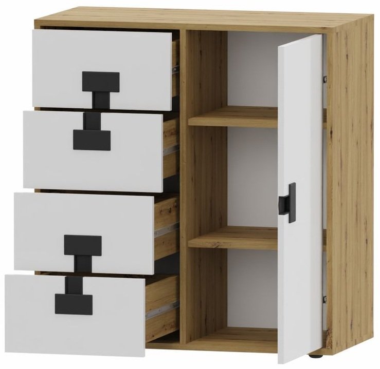 Das Design der Kommode ist so gestaltet, dass es sich unterschiedlichen Einrichtungsstilen anpasst. In einem minimalistischen Ambiente betont sie Helligkeit und klare Linien, in rustikaler Umgebung harmoniert sie wunderbar mit Holzelementen. Die weiße Hochglanzfläche unterstreicht die Frische des Raums, während die Holzstruktur der Eiche Artisan Wärme und natürliche Eleganz hinzufügt. Diese Kombination eignet sich ideal für alle, die ein angenehmes, harmonisches und modernes Wohngefühl schaffen möchten.