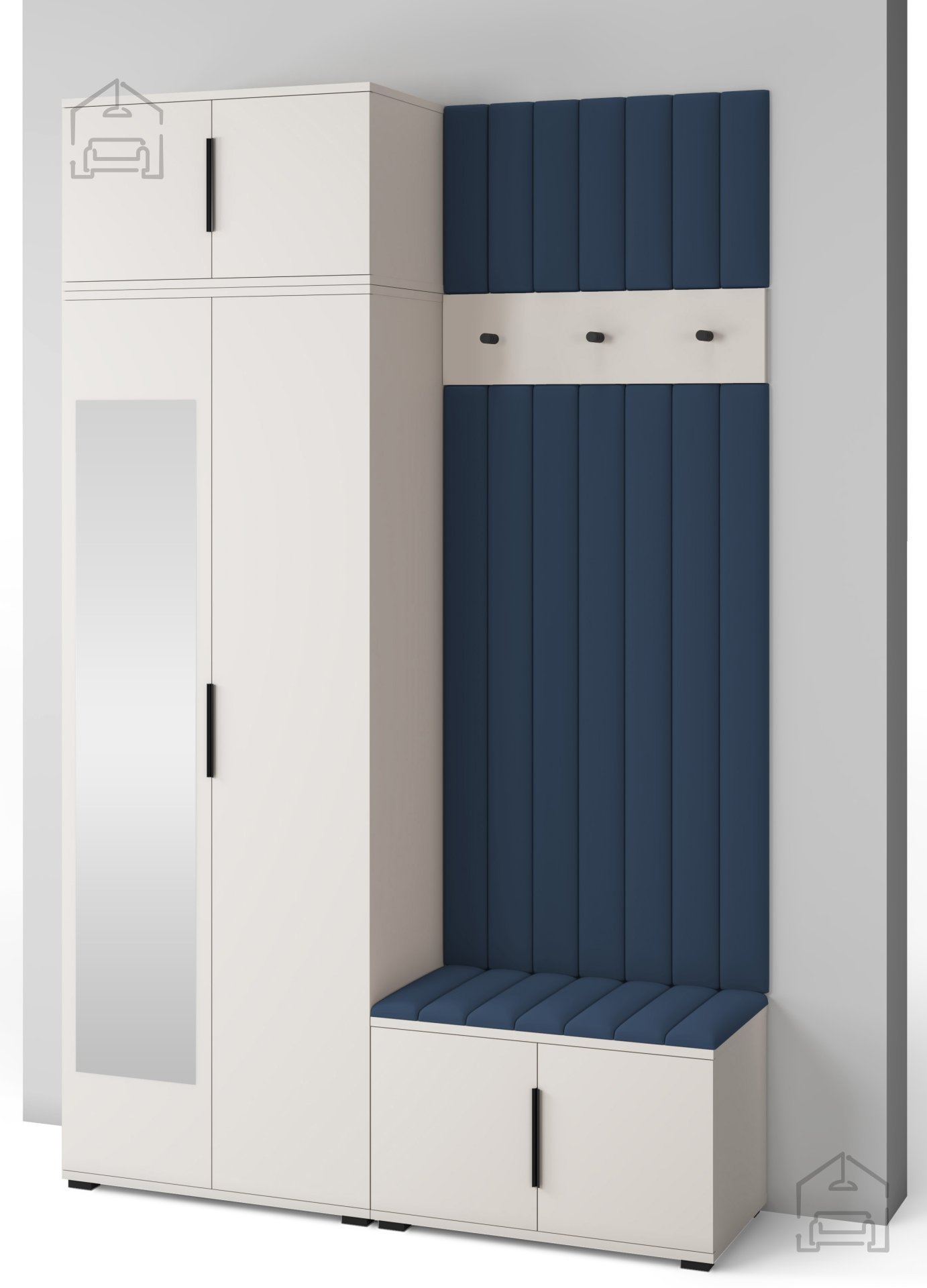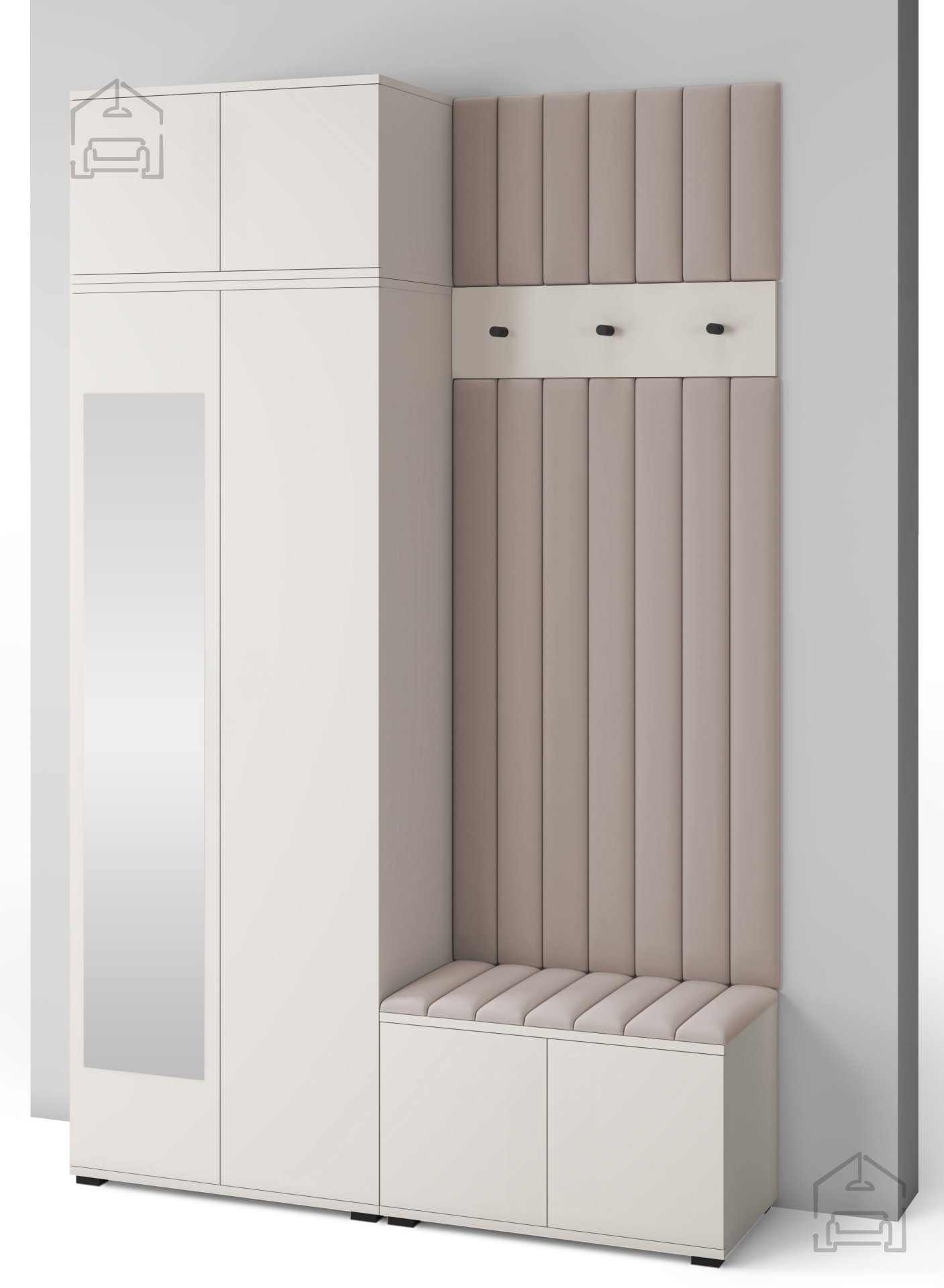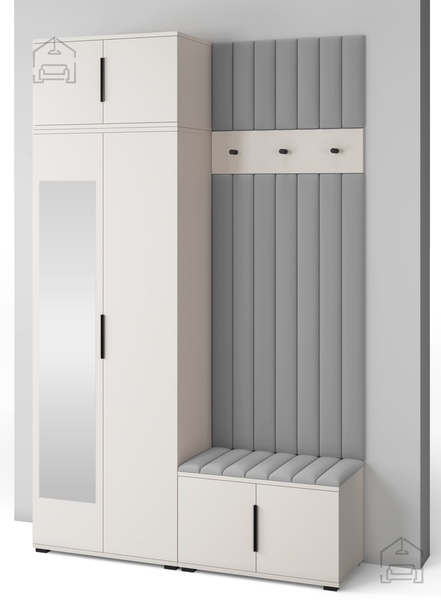 Jedes Element erfüllt seinen Zweck – vom geräumigen Schrank für Kleidung und Schuhe bis hin zur bequemen Sitzfläche, die das An- und Ausziehen erleichtert. Die gepolsterten Wandpaneele aus Trinity-Stoff ergänzen das Ensemble mit ihrer weichen Haptik und dekorativen Wirkung, während sie gleichzeitig die Wand vor Schmutz und Kratzern schützen.