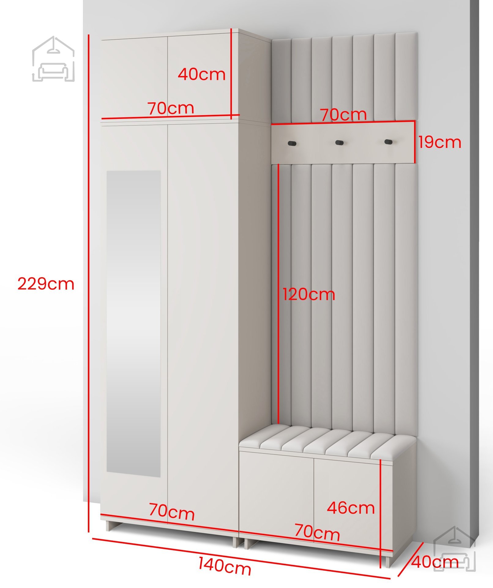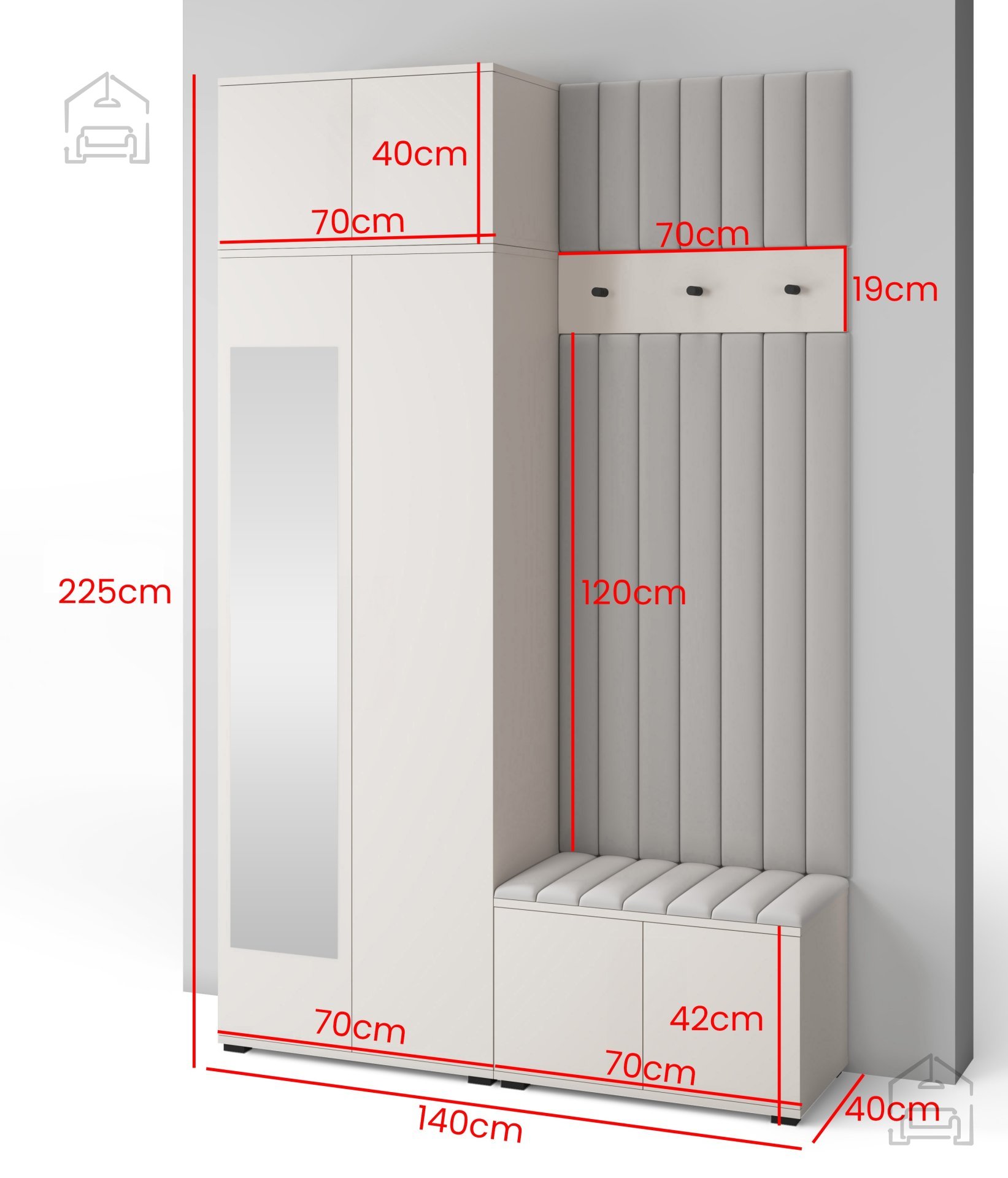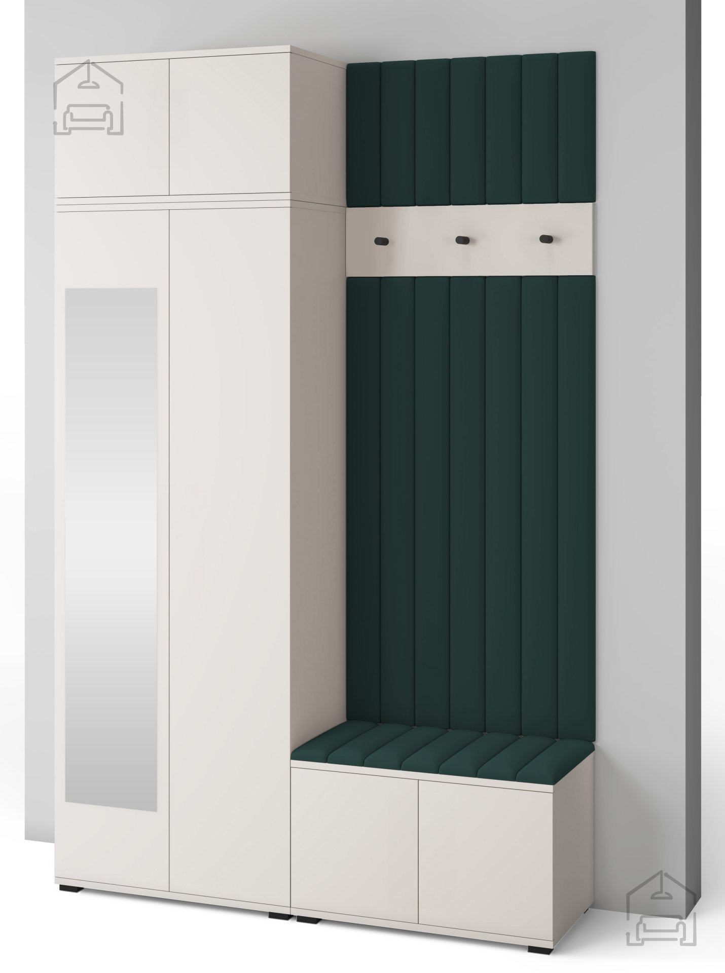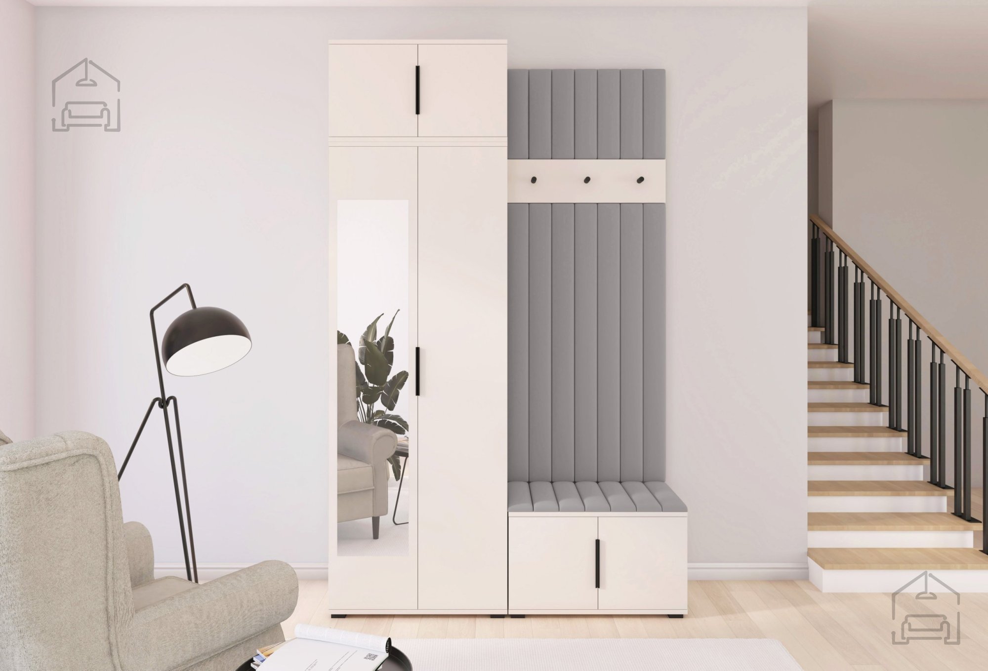 Jedes Element erfüllt seinen Zweck – vom geräumigen Schrank für Kleidung und Schuhe bis hin zur bequemen Sitzfläche, die das An- und Ausziehen erleichtert. Die gepolsterten Wandpaneele aus Trinity-Stoff ergänzen das Ensemble mit ihrer weichen Haptik und dekorativen Wirkung, während sie gleichzeitig die Wand vor Schmutz und Kratzern schützen.