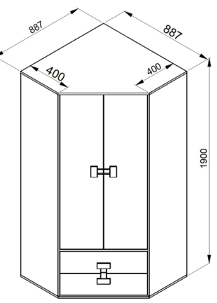 Mit Maßen von 88,7×88,7×190 cm passt sich der Schrank perfekt in eine Raumecke ein und bietet dennoch überraschend viel Stauraum. Die Ecklösung eignet sich besonders für kleinere Räume, in denen jeder Quadratmeter zählt. Dank seiner Form nutzt der Schrank ungenutzte Ecken ideal aus und schafft so Platz für Kleidung, Schuhe oder persönliche Gegenstände – übersichtlich und ordentlich verstaut.
