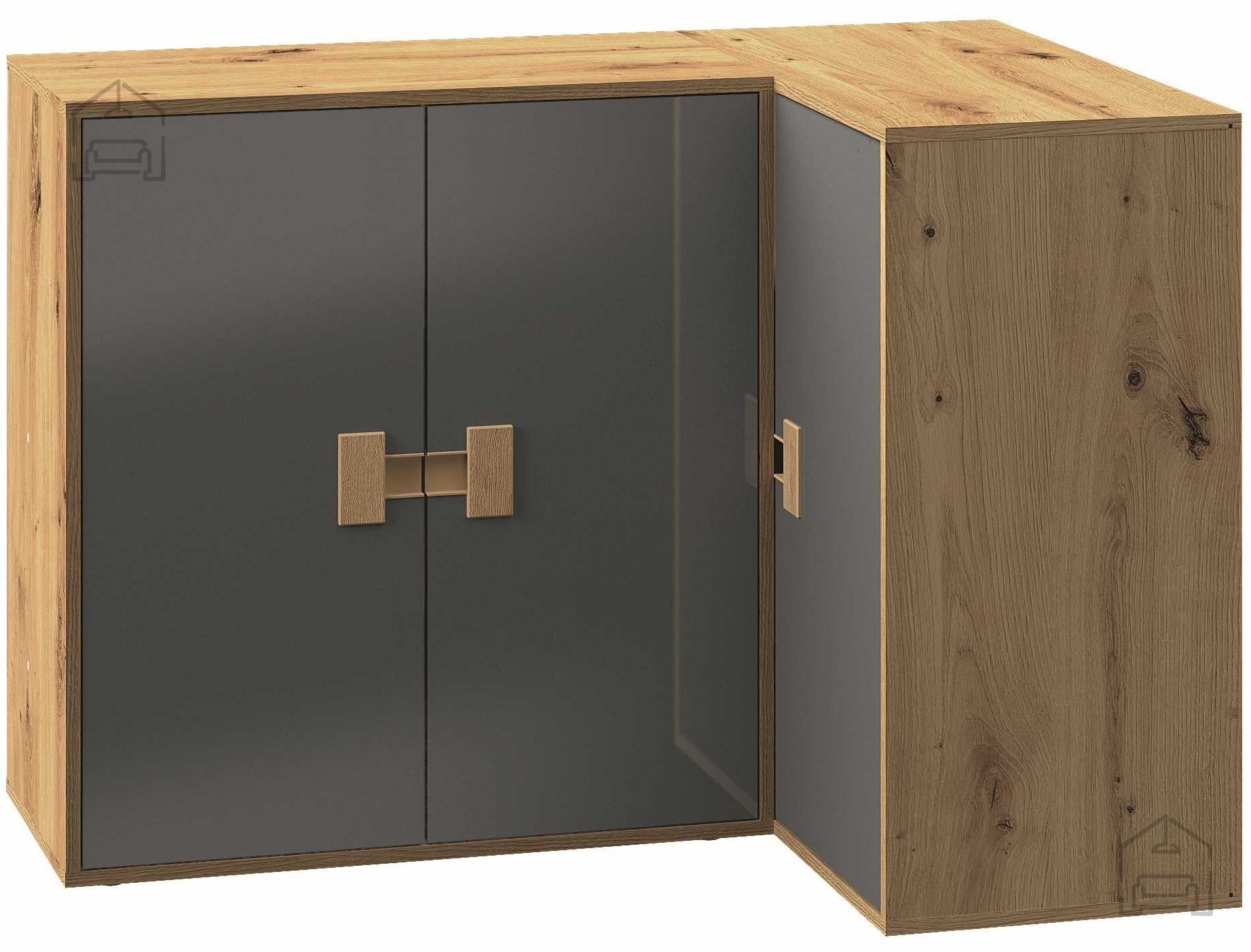 Die Eckkommode Index 09 der Marke Domel vereint modernes Design mit einer durchdachten Funktionalität, die den Platz in Wohn-, Ess- oder Arbeitszimmer optimal nutzt. Der Kontrast zwischen der grauen Hochglanzoberfläche und dem Artisan-Eichendekor sorgt für ein harmonisches Erscheinungsbild, das sowohl zu hellen als auch zu dunkleren Einrichtungen passt. Durch ihre spezielle Eckform nutzt die Kommode ungenutzte Raumecken effizient aus und vermittelt dennoch ein Gefühl von Offenheit und Ordnung.