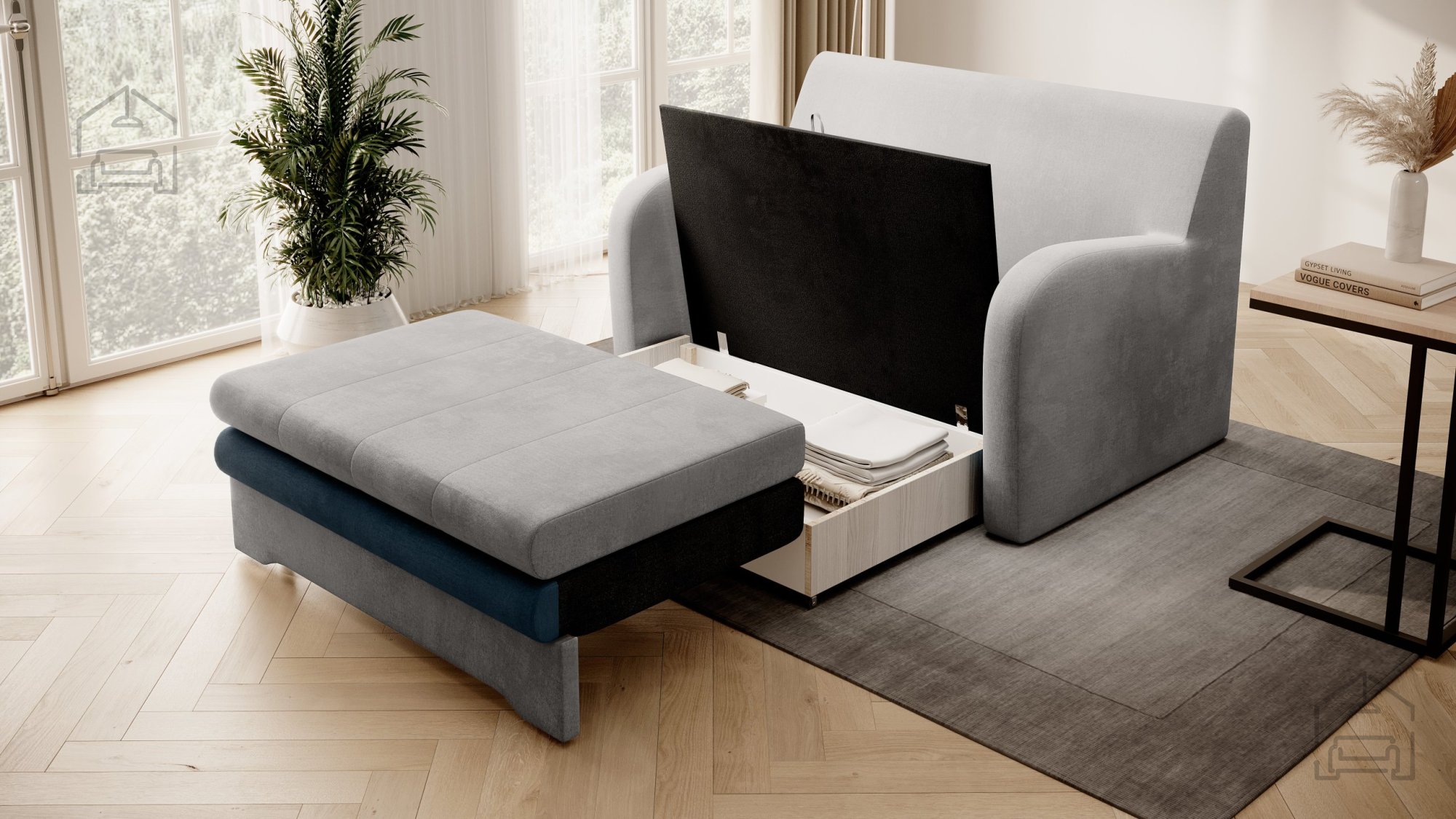Die Ausziehfunktion mit Teleskopmechanismus macht die Handhabung besonders einfach: Sitzfläche vorziehen, Rückenlehne abklappen – und schon entsteht in wenigen Sekunden eine gleichmäßige Liegefläche. Da der Zweisitzer zusätzlich über einen Bettkasten verfügt, ist kein zusätzlicher Stauraum erforderlich. Eine ideale Lösung für kleinere Wohnungen, Appartements oder Gästezimmer.