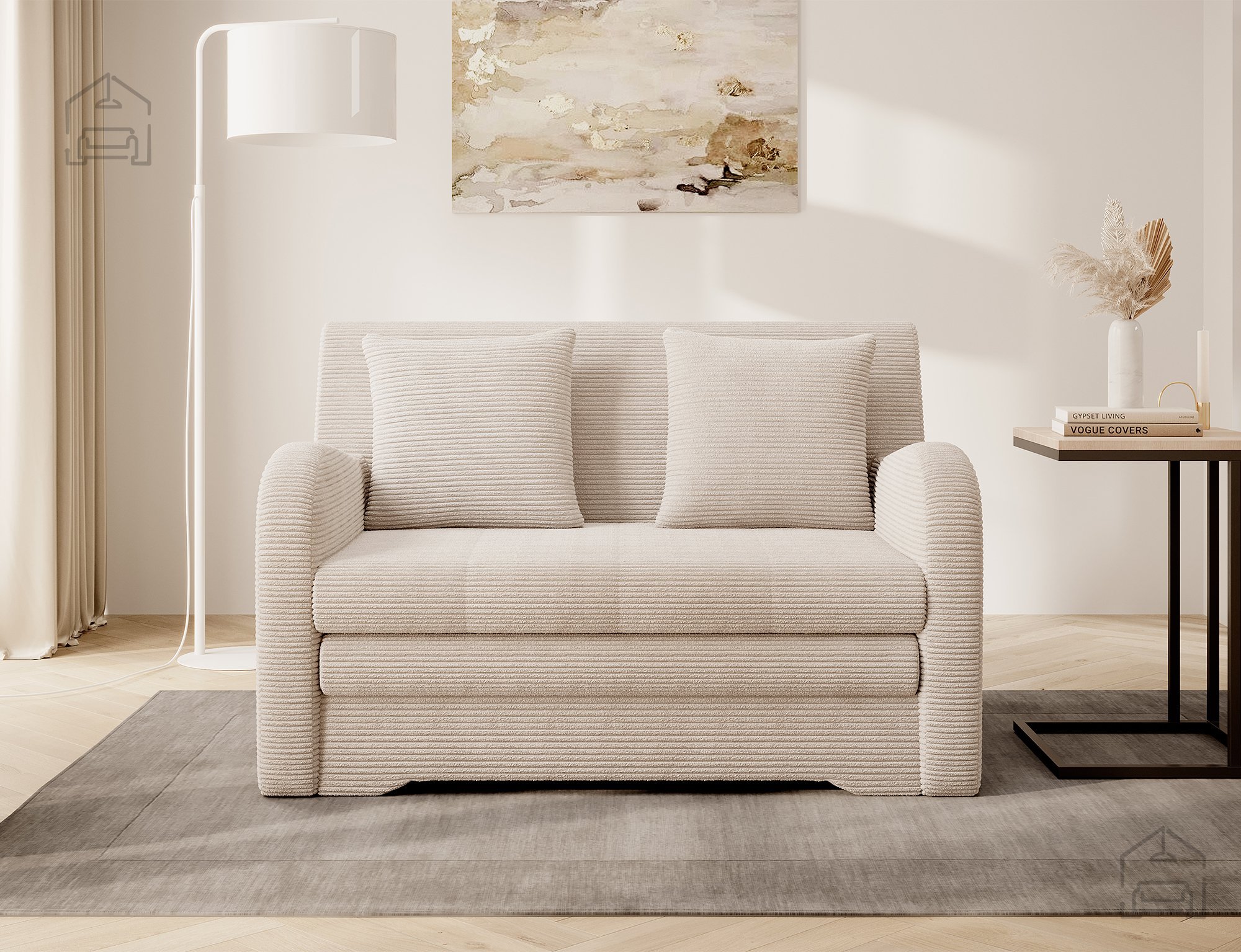 Ein besonderes Merkmal des Modells Ario ist der einfache Teleskop-Mechanismus, mit dem sich der Zweisitzer rasch in eine Liegefläche von 196 x 111 cm verwandeln lässt. Diese Funktion ist besonders praktisch, wenn das Sofa als Gästebett oder als Hauptschlafplatz in kleineren Wohnungen genutzt wird. Unter der Sitzfläche befindet sich ein großzügiger Bettkasten mit den Maßen ca. 85 x 61 x 13 cm, ideal zum Verstauen von Decken, Pölstern oder anderen Textilien. Alle Elemente sind so konstruiert, dass sie sich mühelos bedienen lassen.