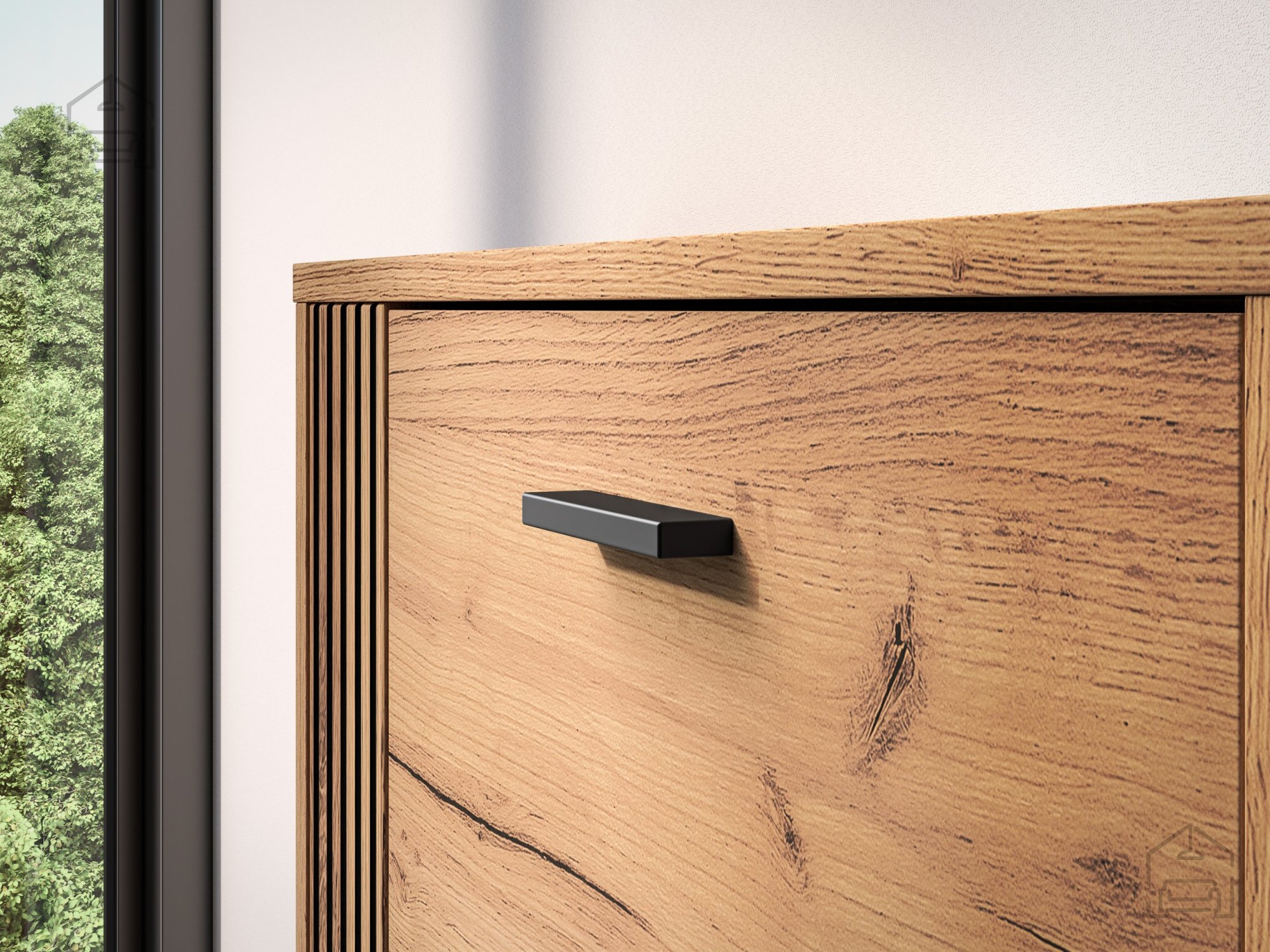 Die Kombination aus Gold Craft Eiche und Schwarz schafft einen harmonischen Kontrast, der sich perfekt in verschiedene Einrichtungsstile einfügt – von minimalistisch bis industriell. Die schwarzen, vertikalen Leisten auf der linken Seite verleihen dem Möbelstück eine dynamische Optik und einen Hauch moderner Eleganz. Damit ist der Schrank nicht nur funktional, sondern auch ein stilvoller Blickfang im Raum.