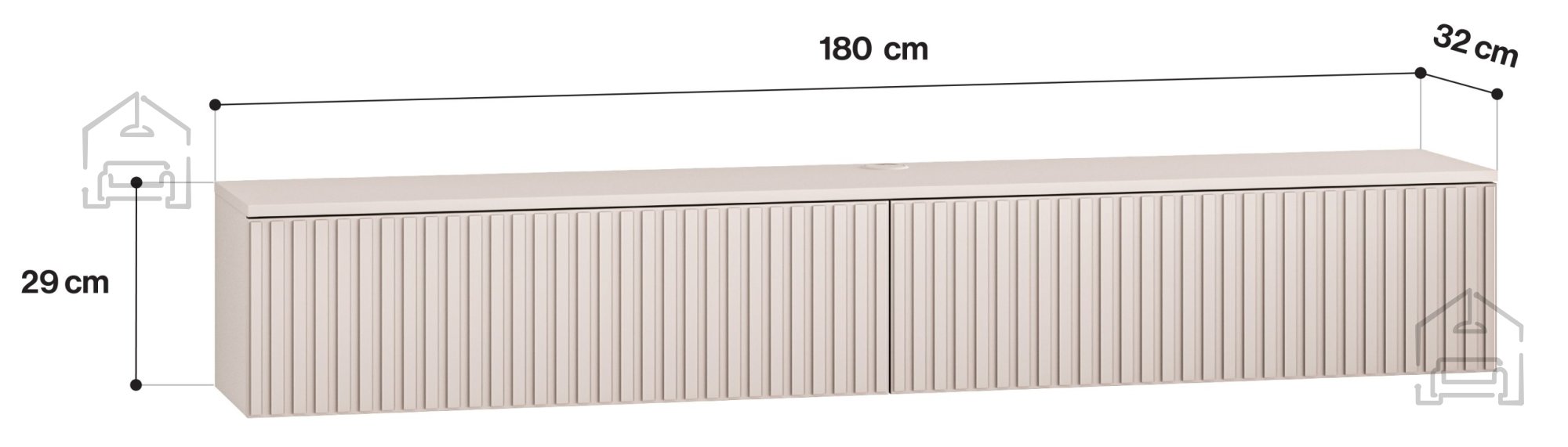 Die Wandmontage sorgt nicht nur für ein modernes Erscheinungsbild, sondern spart auch Platz, da sich darunter zusätzliche Accessoires oder Dekorationen platzieren lassen. Mit ihren kompakten Maßen von 180x32x29 cm eignet sie sich sowohl für großzügige Wohnzimmer als auch für kleinere Räume, in denen jeder Zentimeter zählt.