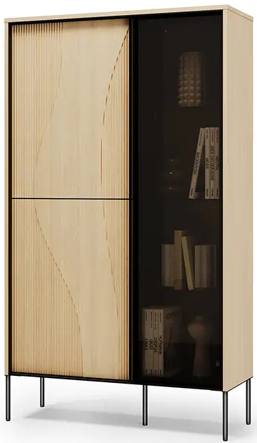 Die Flow FW-01 passt hervorragend ins Wohnzimmer, Esszimmer oder auch in größere Vorzimmer. Im Wohnzimmer dient sie als Vitrine für Bücher, Souvenirs oder Pflanzen im Glasbereich, während der geschlossene Teil für Ordnung bei Dokumenten oder Textilien sorgt. Im Esszimmer ergänzt sie mit ihrer Holz-Schwarz-Kombination harmonisch den Esstisch und die Stühle. Dank ihrer ausgewogenen Maße fügt sie sich auch gut in kleinere Räume ein, ohne wuchtig zu wirken.