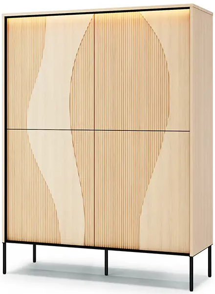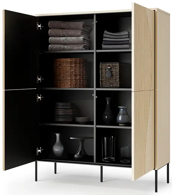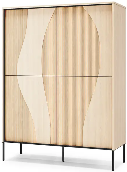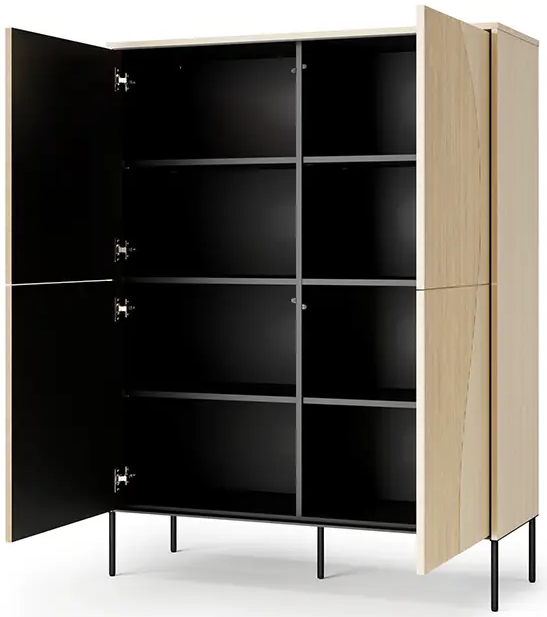 Das Modell Flow FW-02 überzeugt mit einer praktischen Innenaufteilung und vier geräumigen Türen, hinter denen sich viel Platz zum Verstauen verbirgt. Die Einlegeböden im Inneren ermöglichen eine übersichtliche Organisation von Geschirr, Textilien, Dokumenten oder anderen Dingen, die Sie gerne griffbereit, aber nicht sichtbar aufbewahren möchten. Durch die höhere Bauweise bietet die Kommode zusätzlich eine Ablagefläche auf der Oberseite – ideal für Dekorationen, Pflanzen oder eine Lampe.