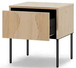 Der Korpus des Nachttisches besteht aus laminierter Spanplatte mit 16 mm Stärke, was Stabilität und Langlebigkeit garantiert. Die Front wird aus einer 18 mm starken MDF-Platte gefertigt, wodurch die Oberfläche besonders glatt und abriebfest ist. Diese Materialkombination sorgt für ein ausgewogenes Verhältnis zwischen Robustheit und ansprechender Optik, sodass der Nachttisch auch nach langem Gebrauch sein gepflegtes Aussehen behält.
