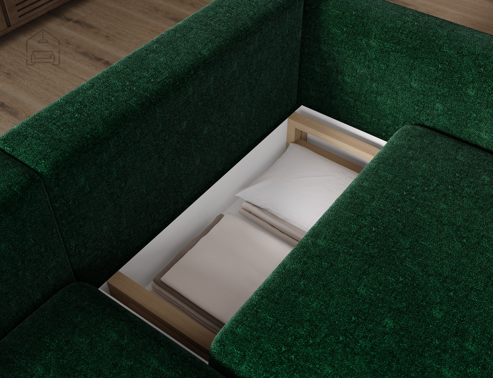 Der eingebaute Bettkasten bietet zusätzlichen Stauraum für Decken, Pölster oder Bettwäsche und erhöht so die Alltagstauglichkeit.