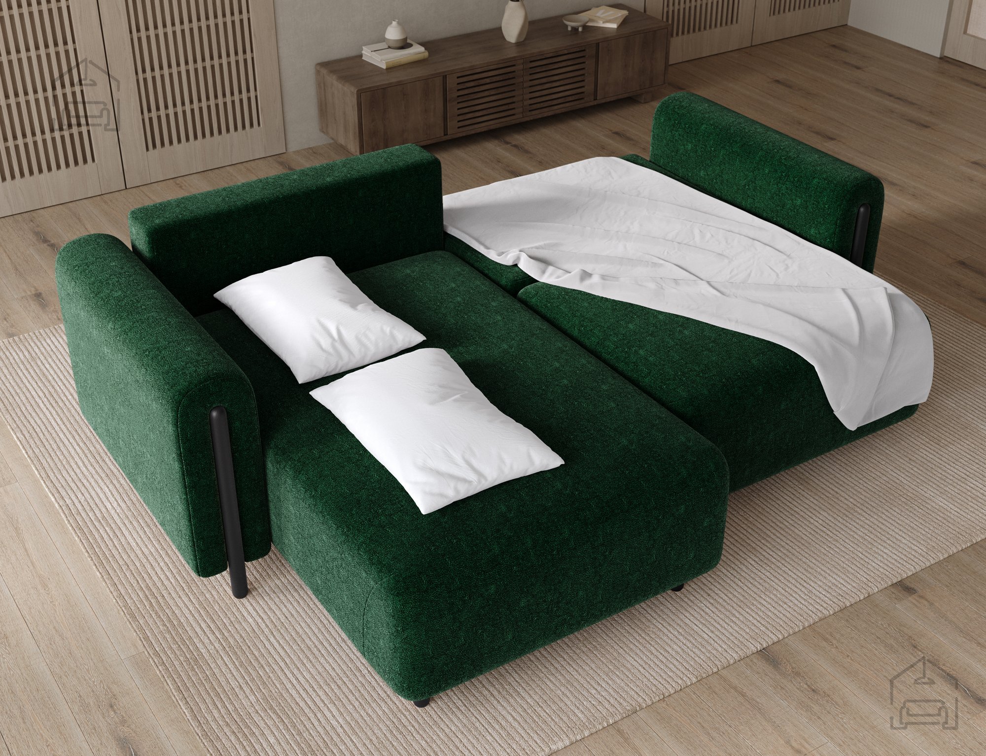 Der Euro-Mechanismus ermöglicht ein schnelles und müheloses Umwandeln der Couch in ein Bett. Das Ausziehen funktioniert leichtgängig, ohne Ruckeln oder Belastung der Konstruktion. Durch die durchdachte Bauweise bleibt das ausgezogene Bett stabil und bietet angenehmen Schlafkomfort.