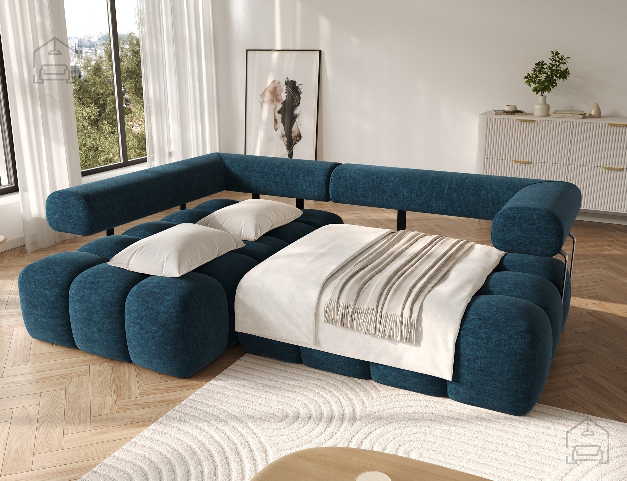 Das Modell Levvi verfügt außerdem über eine praktische Liegefläche von 187x110 cm, die sich im Handumdrehen in ein bequemes Bett verwandeln lässt. Auch ohne Bettkasten bietet die Schlafunktion ausreichend Platz für Gäste oder ein entspanntes Nickerchen. Mit einer Breite von 110 cm verbindet sie Kompaktheit mit Komfort. Die Rückseite ist vollständig bezogen, sodass die Garnitur frei im Raum platziert werden kann – ideal, um den Wohnbereich offen und flexibel zu gestalten.