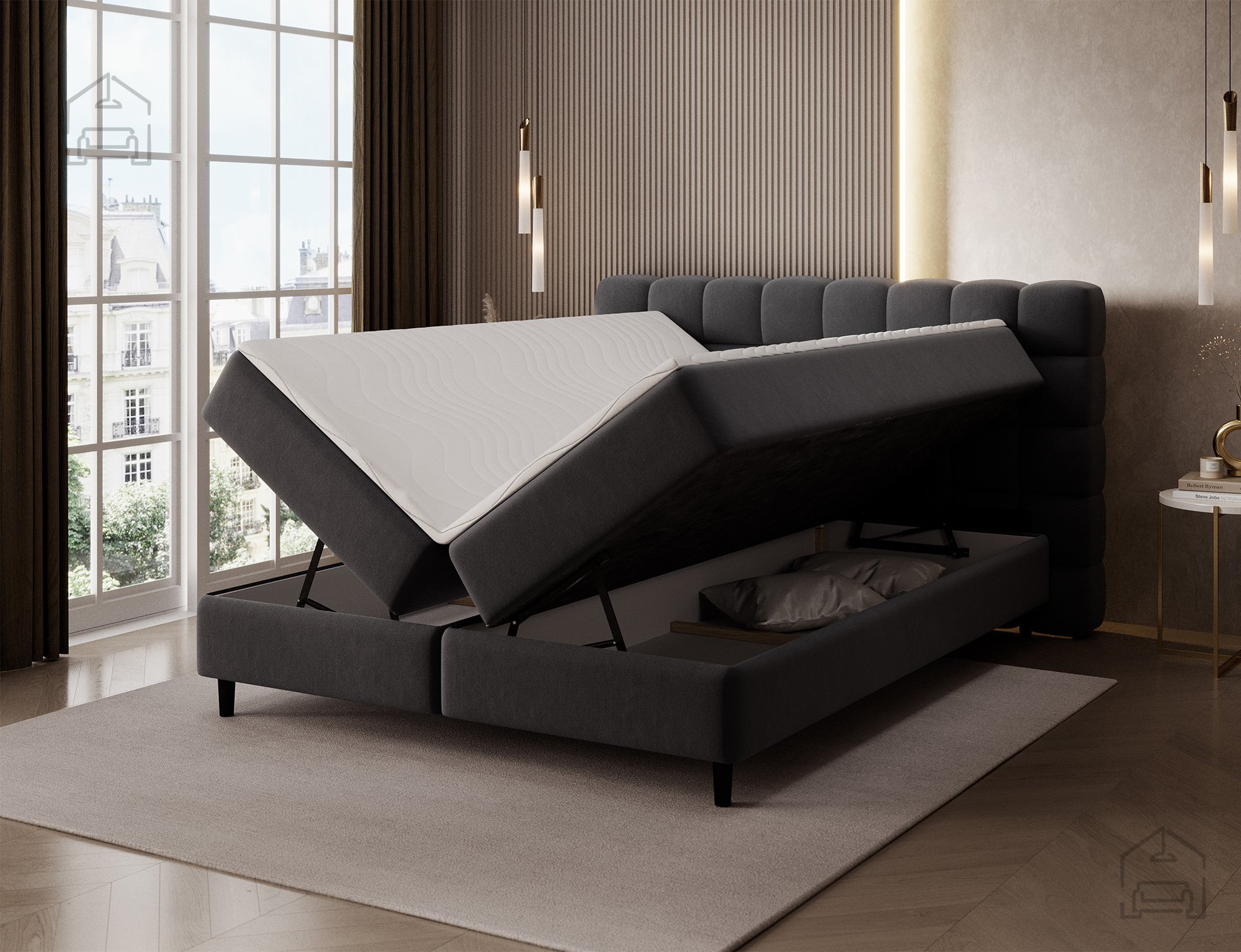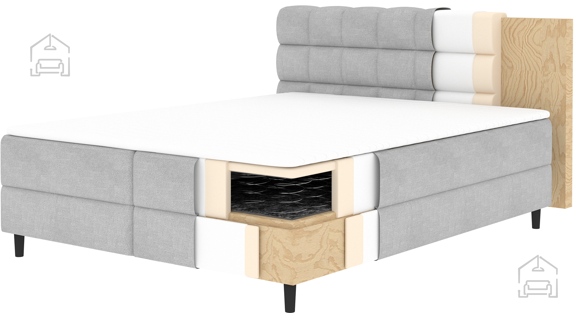 Der Holzrahmen sorgt für Stabilität, während die Kombination verschiedener Schäume für angenehme Weichheit und Elastizität sorgt. Der Stoff fühlt sich angenehm an und ist gleichzeitig widerstandsfähig gegen tägliche Beanspruchung. Schwarze Holzfüße schaffen einen eleganten Kontrast und erleichtern das Reinigen unter dem Bett, da sie genügend Platz für Staubsauger oder Besen lassen.