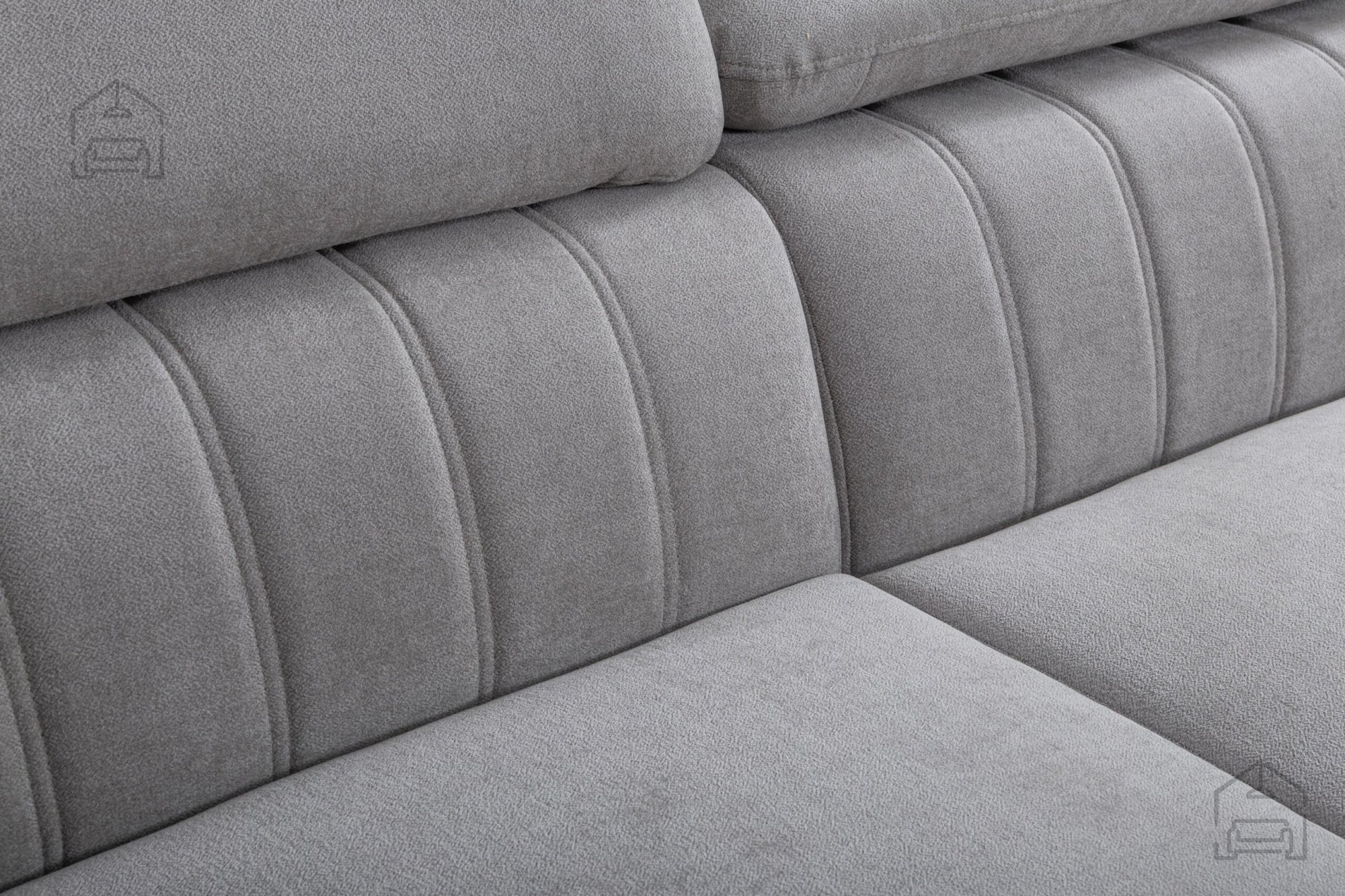 Neben der Schlaffunktion verfügt das Sofa über einen Bettkasten, der sich unter einem der Sitze befindet. Diese praktische Lösung bietet Stauraum für Decken, Pölster oder andere Textilien und hilft, den Wohnraum ordentlich und übersichtlich zu halten. Verstellbare Kopfstützen ermöglichen zusätzlich eine individuelle Anpassung des Komforts – perfekt zum Lesen, Fernsehen oder für entspannte Gespräche.