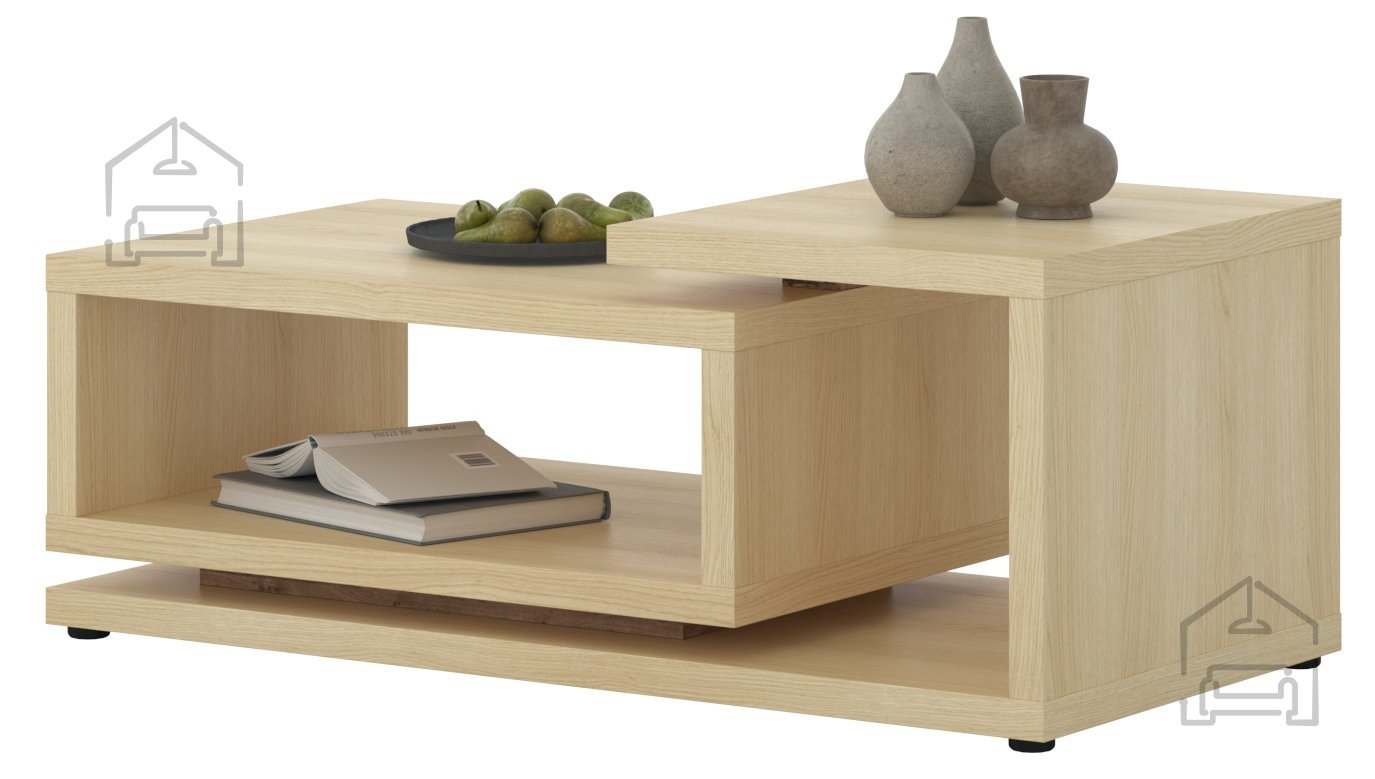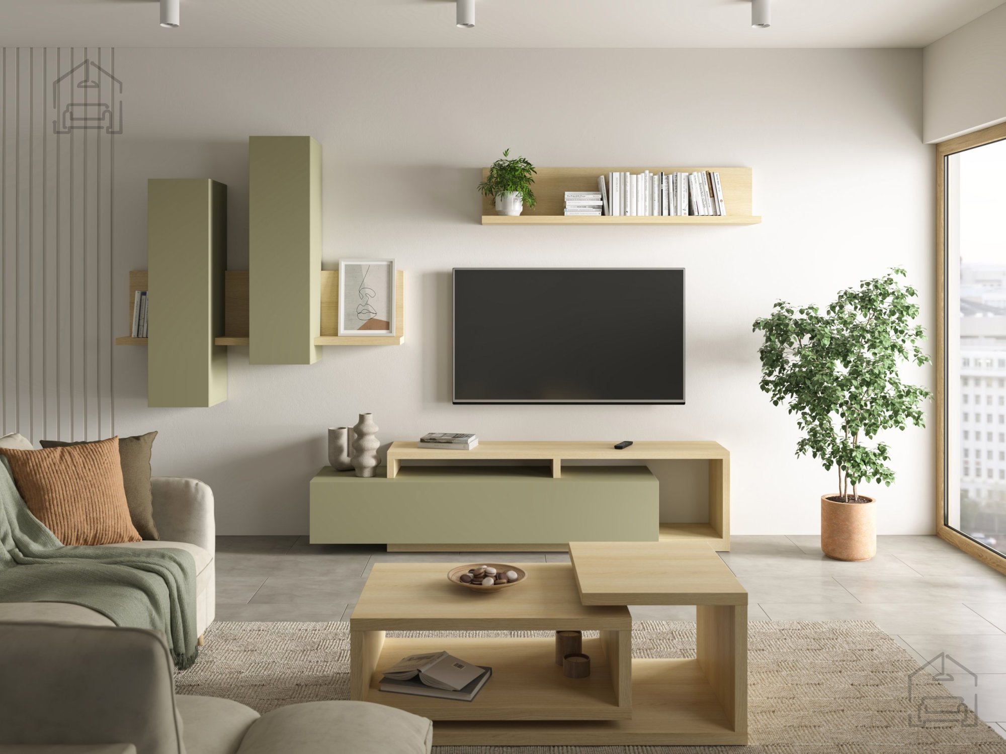 Der Couchtisch Bota – Helvetia meble verbindet modernes Design mit der Wärme natürlicher Farbtöne. Die Kombination aus Eichen- und Eukalyptusfarben sorgt für einen angenehmen Kontrast und verleiht dem Raum Frische und Eleganz. Klare Linien und ausgewogene Proportionen fügen sich mühelos in verschiedenste Einrichtungsstile ein – vom skandinavischen Minimalismus bis zum modernen urbanen Wohnambiente. Der Tisch besteht aus hochwertiger MDF-Platte, was Stabilität, Robustheit und eine lange Lebensdauer garantiert. Die Oberfläche ist pflegeleicht und widerstandsfähig im täglichen Gebrauch – ideal sowohl für Wohn- als auch größere Aufenthaltsräume, in denen Komfort und Funktionalität Hand in Hand gehen.